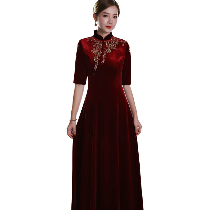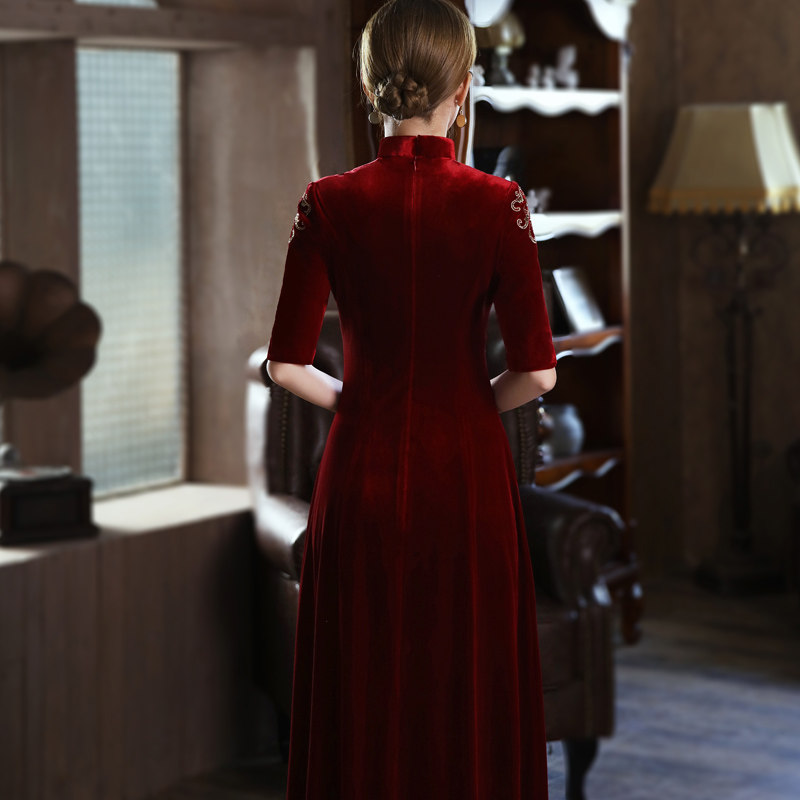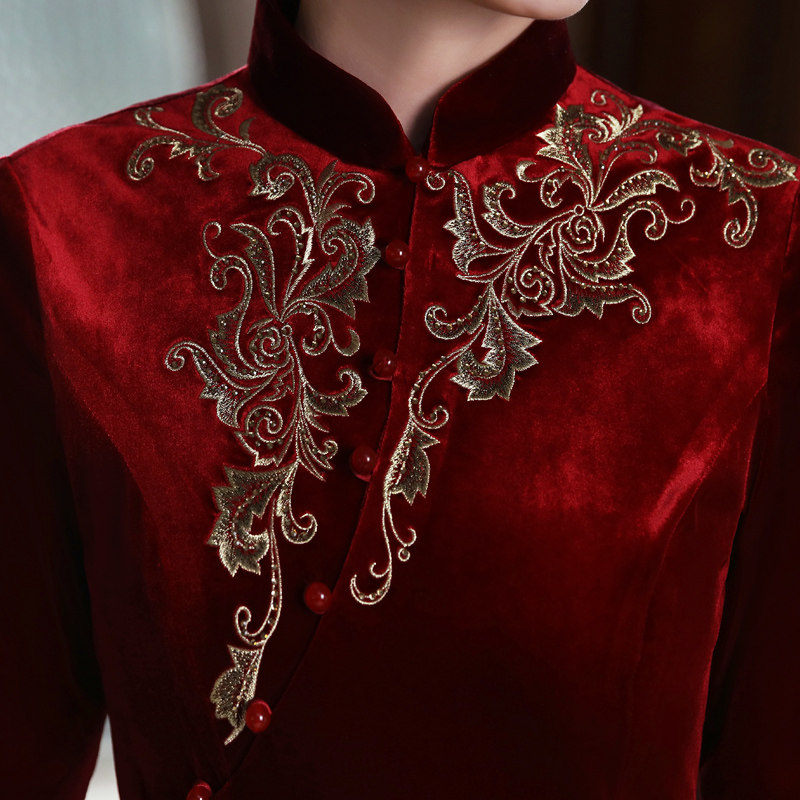 Improved cheongsam autumn and winter long-sleeved thickened mother-in-law wedding dress Noble mother wedding dress gold velvet dress