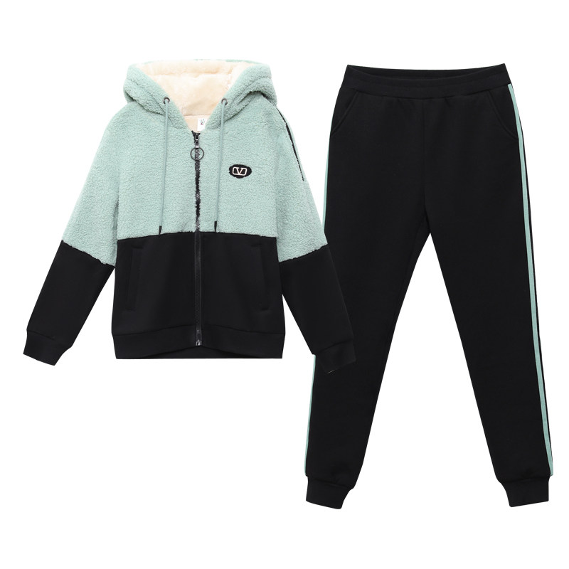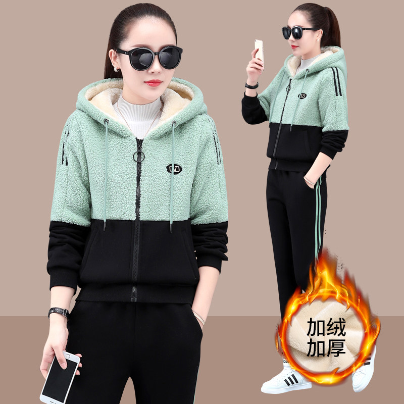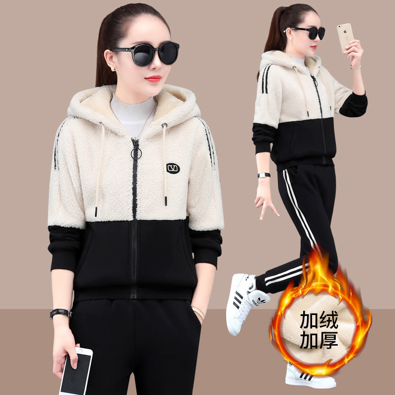 Lamb suede suit woman winter 2022 new Korean version plus suede thickened thick cotton T two sets of parquet color casual sportswear