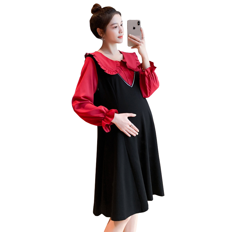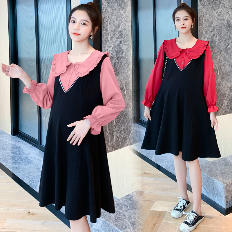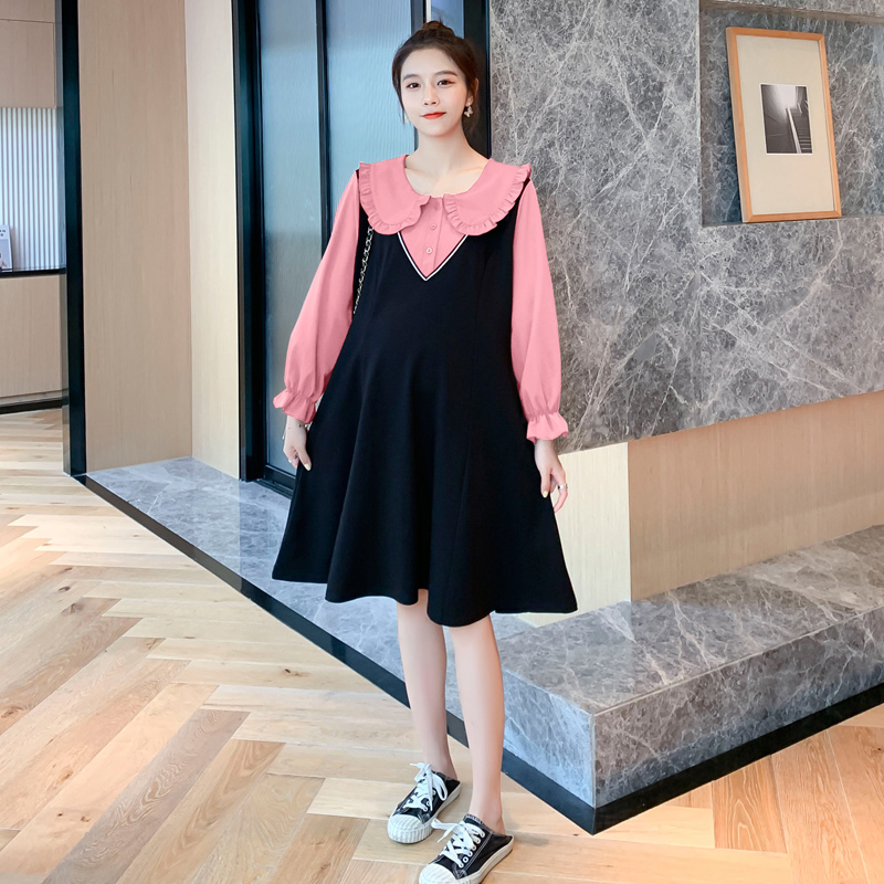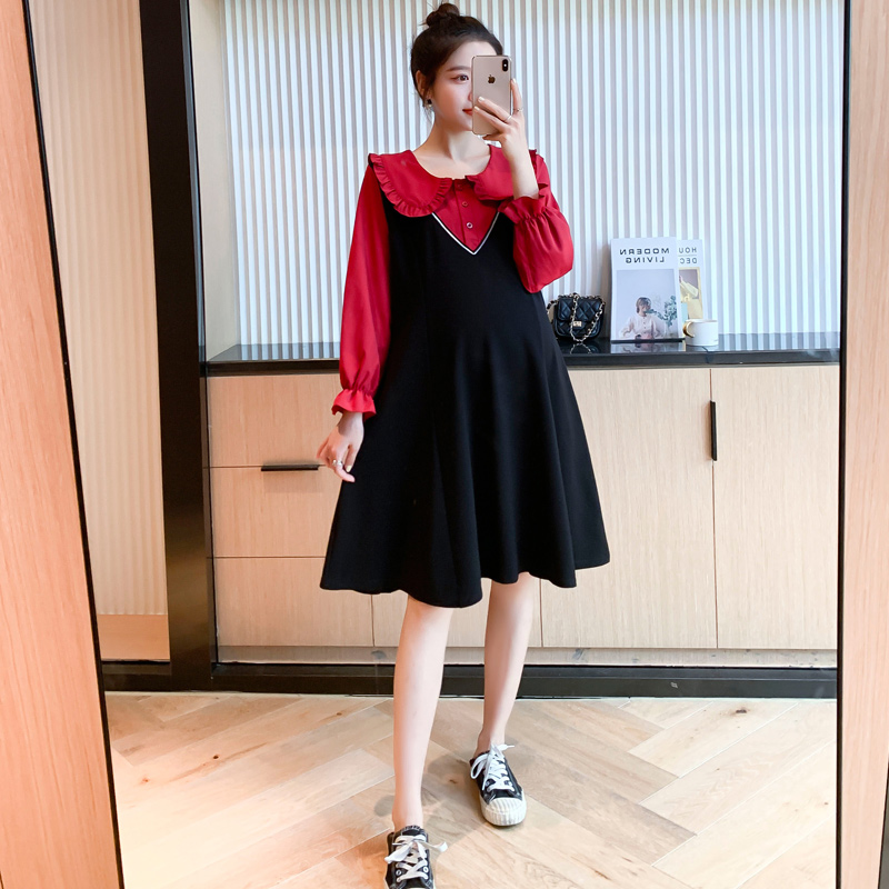 2022 Spring loaded new pregnant women's foreign dress The long version out of the house fake two dolls collar laced black dresses large size