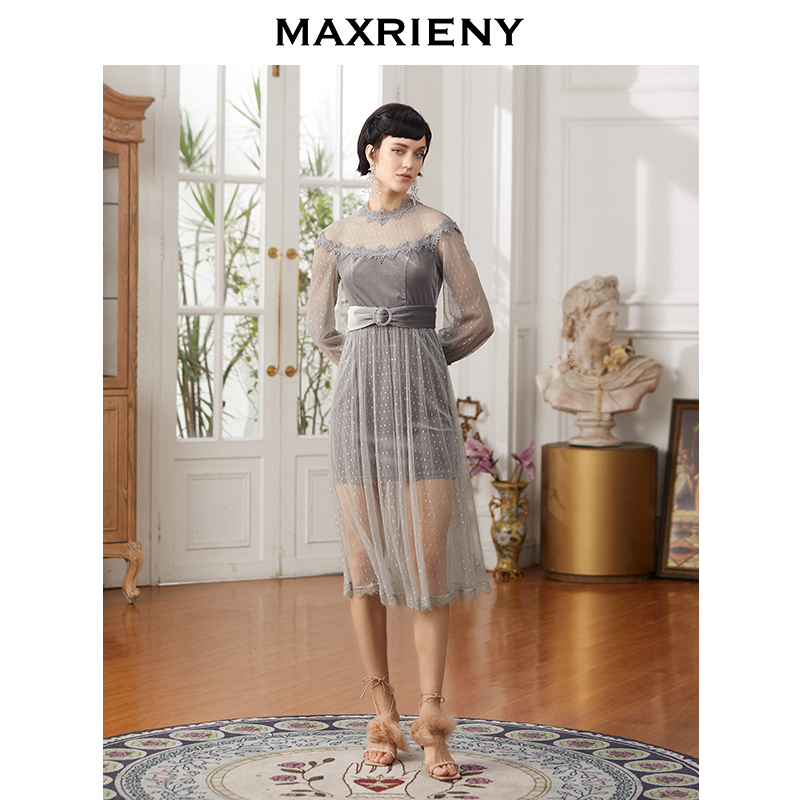 MAXRIENY2020 autumn new retro round point deep grey high waist mesh yarn splicing with long skirt for women
