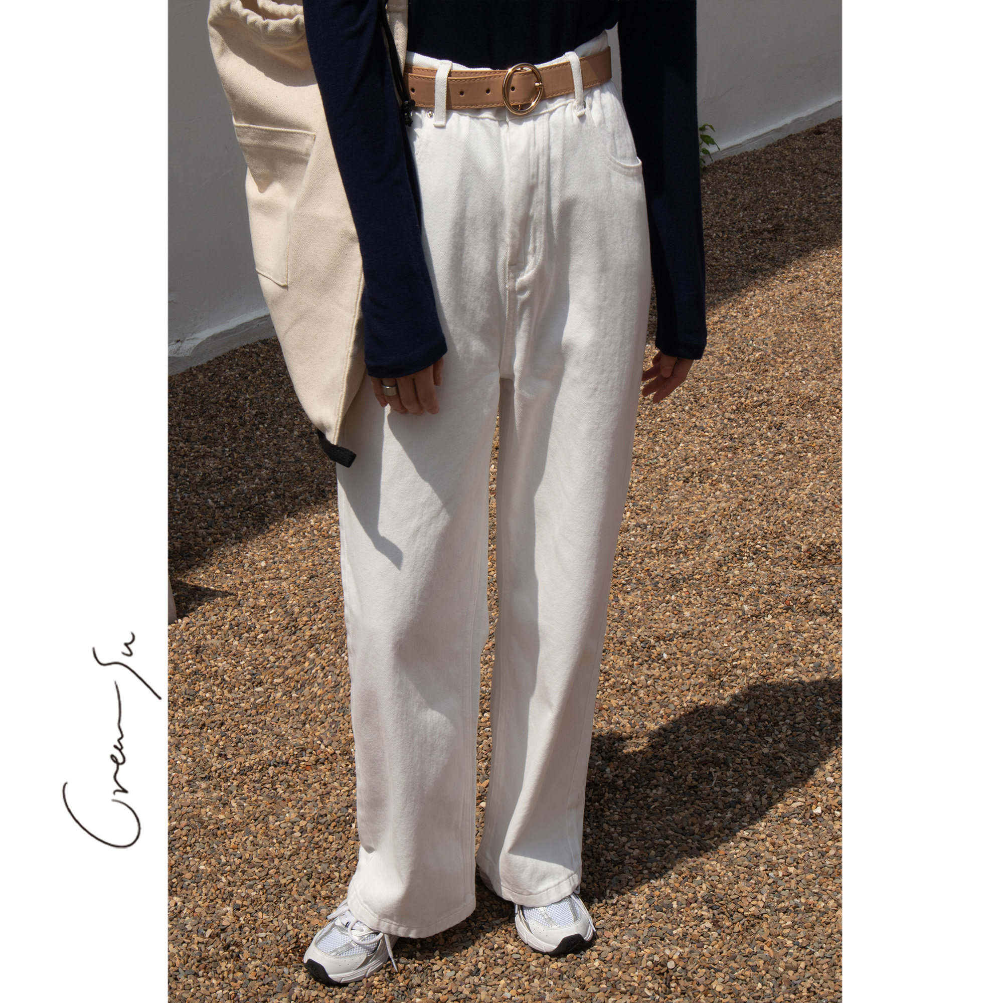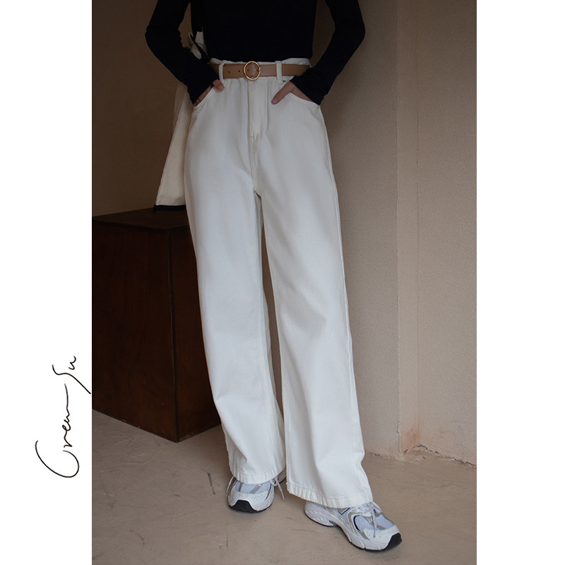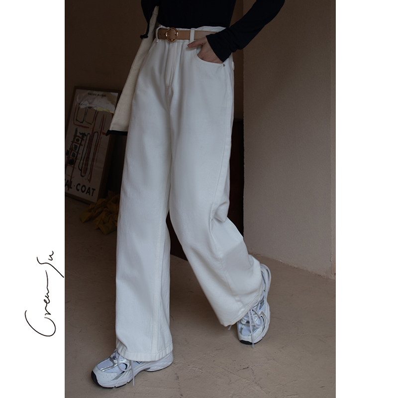 Creamsu Xubai white jeans women's straight loose spring high waist casual wide leg long pants ins tide