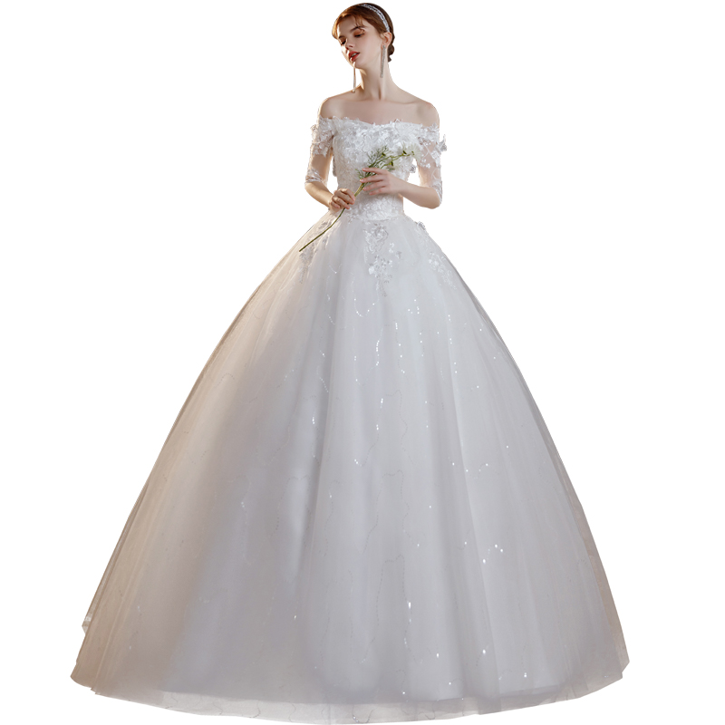 Winter light main wedding gown 2021 Bride new straight shoulder middle sleeve minimalist Ultra Fairy Dreamy Chidgemini