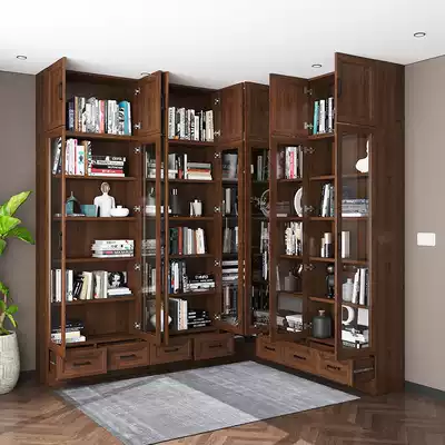 Simple modern corner bookcase bookshelf Study storage cabinet combination solid wood glass door bookcase custom to the top cabinet