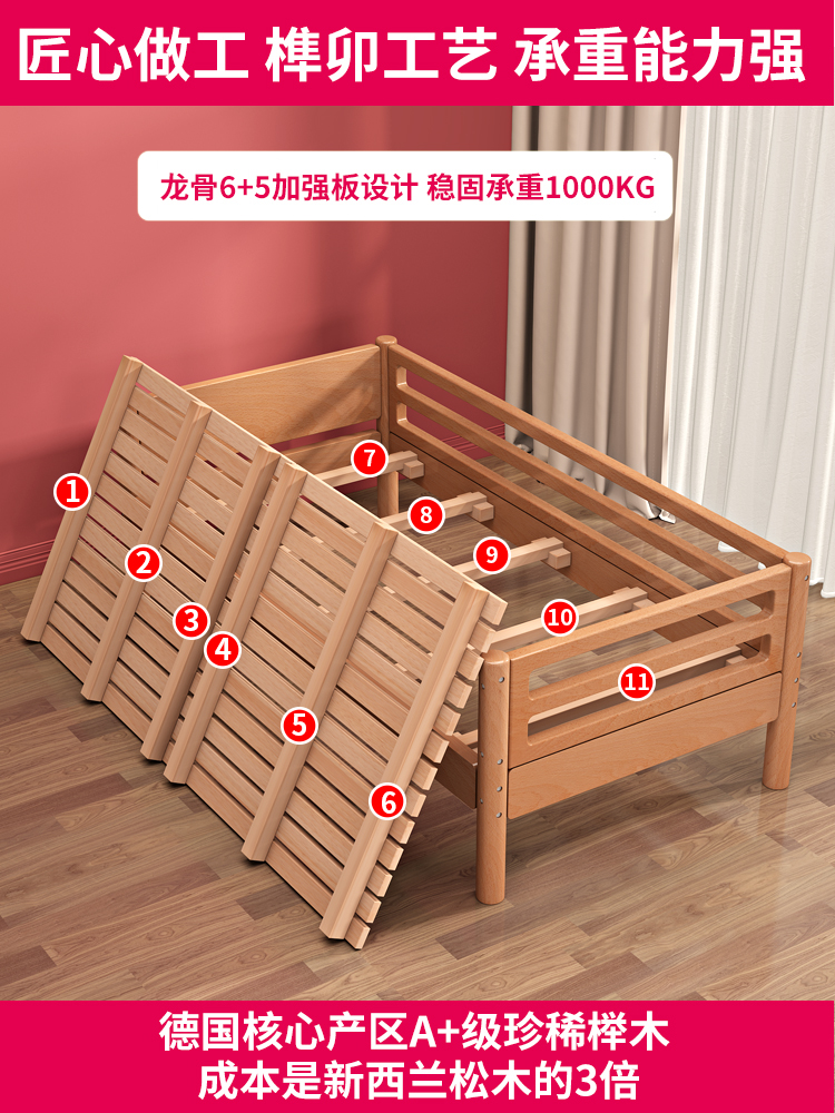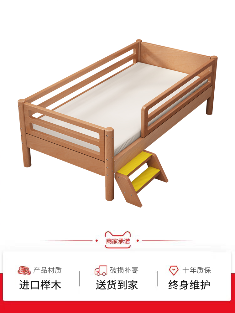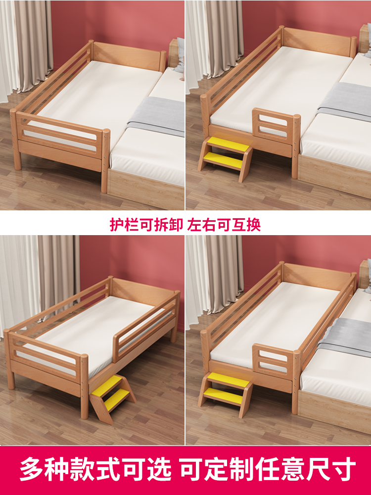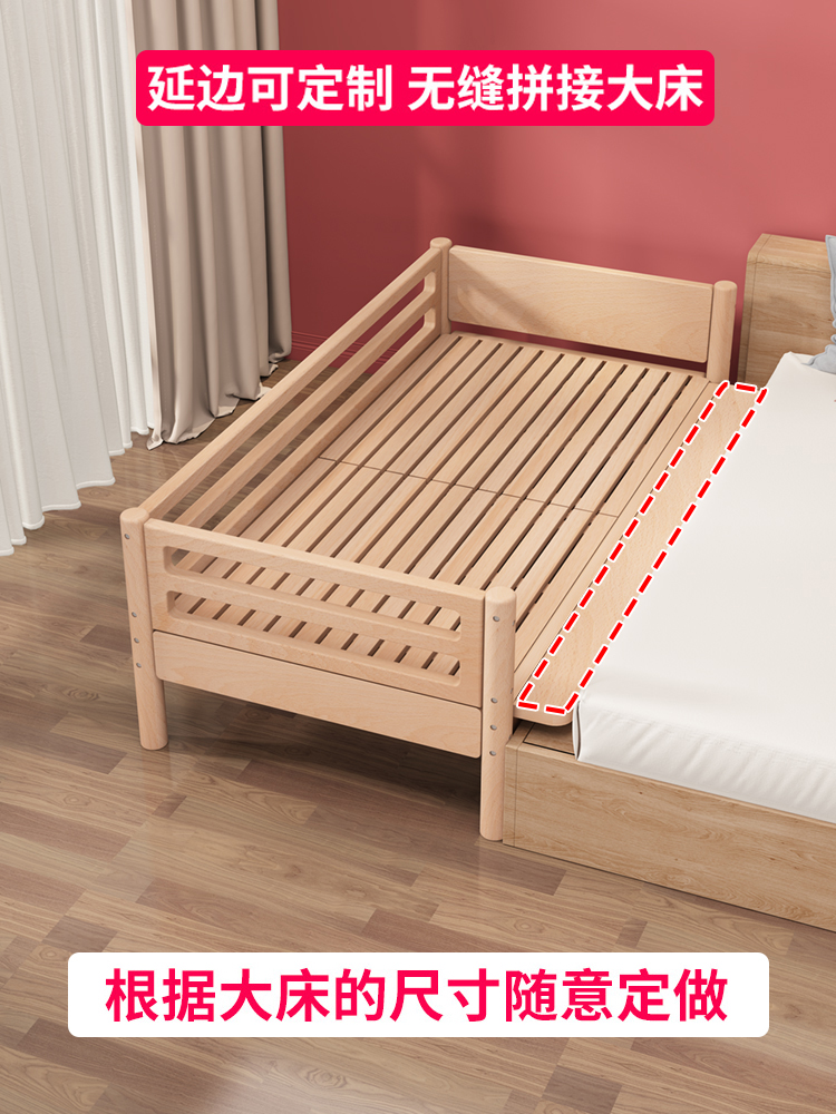 Pure solid beech children's bed with high fence Children's bed widened bed side boy baby bed splicing bed