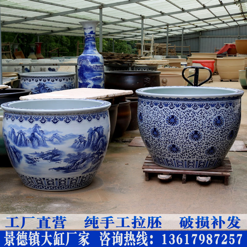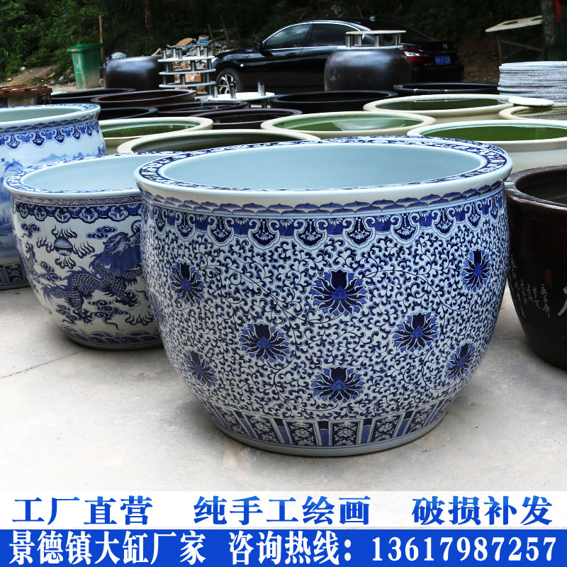 Jingdezhen ceramic large tank fish tank turtle water lily tank blue and white hand-painted twined lotus extra-large living room decorative ornaments