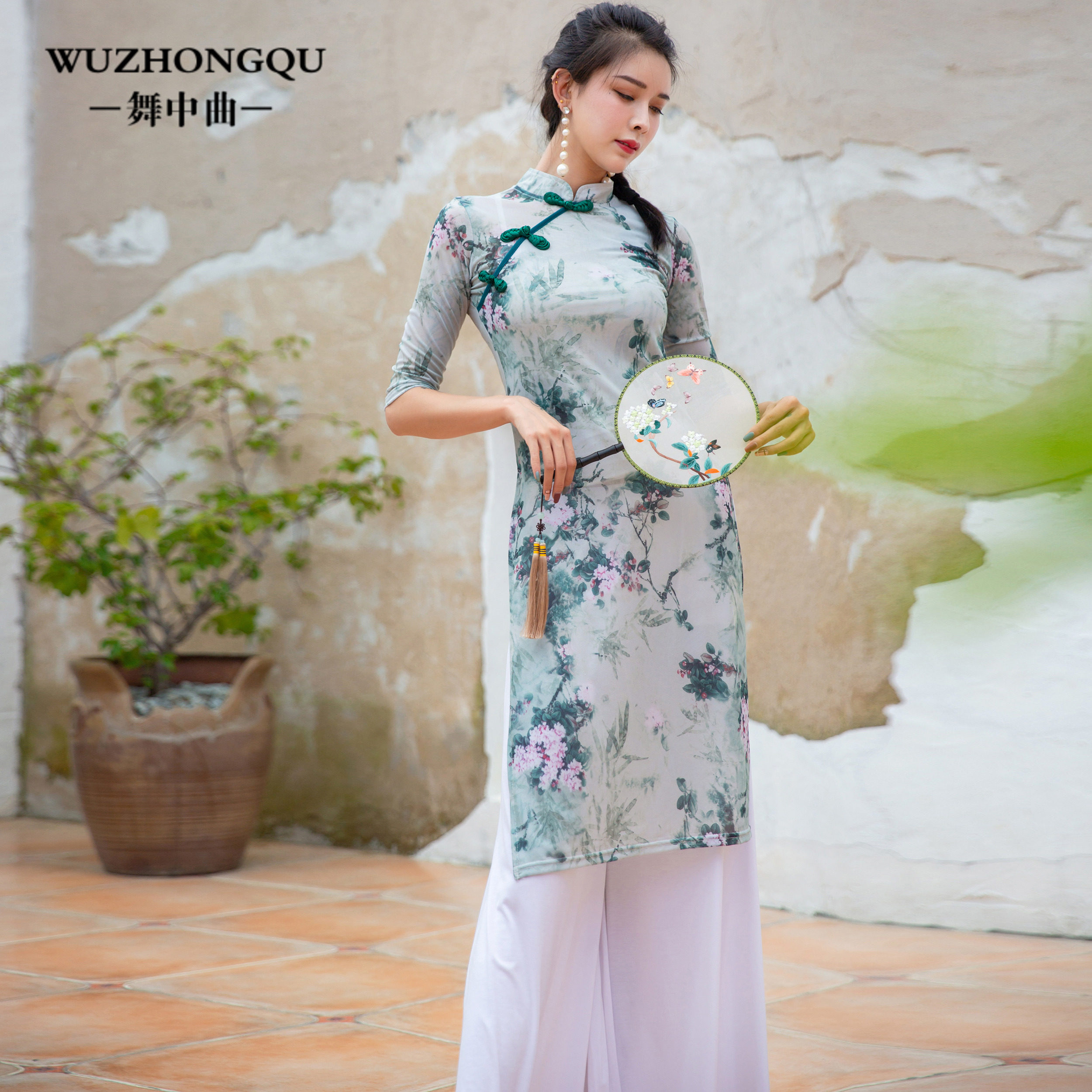 Plum blossom red cheongsam green flower cheongsam white wide pants