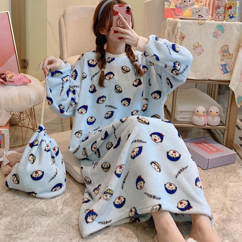 Pajamas women's autumn and winter thickened coral fleece long nightdress loose large size cute student flannel pregnant women home clothes