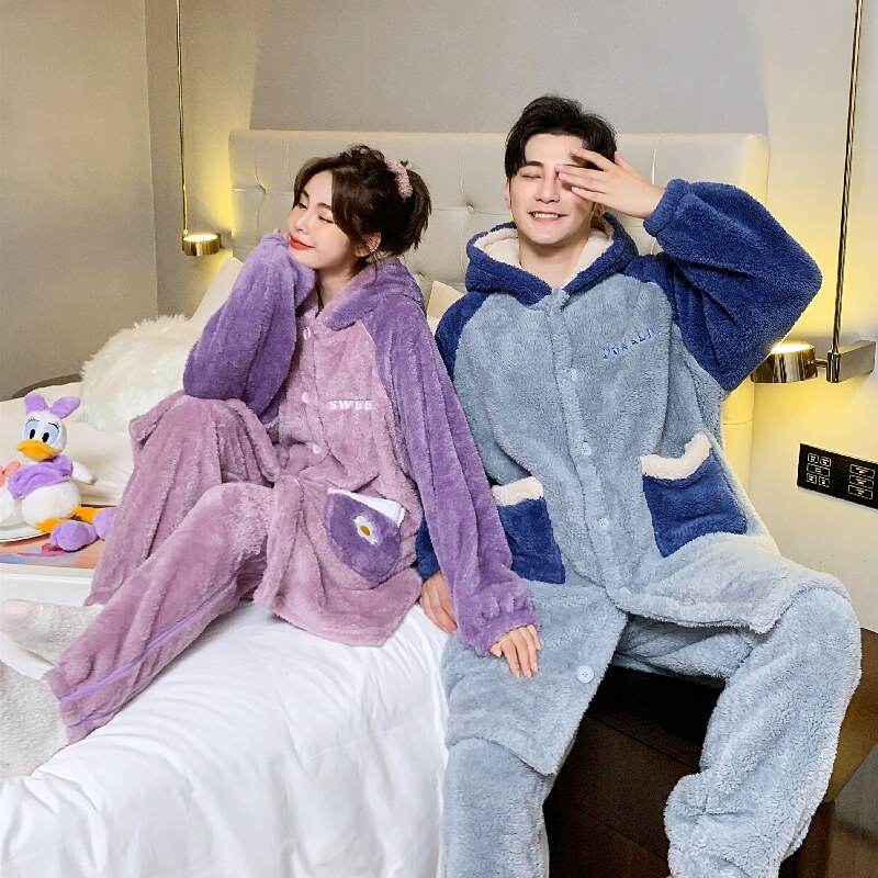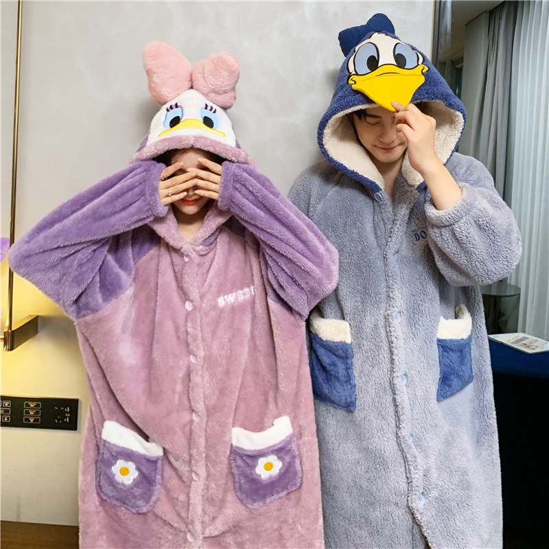 Cute couple's nightgown women's autumn and winter plus velvet thickened coral velvet vibrating pajamas long bathrobe home service men