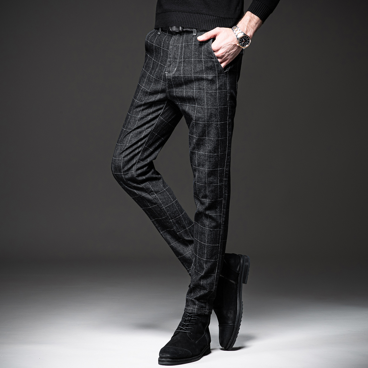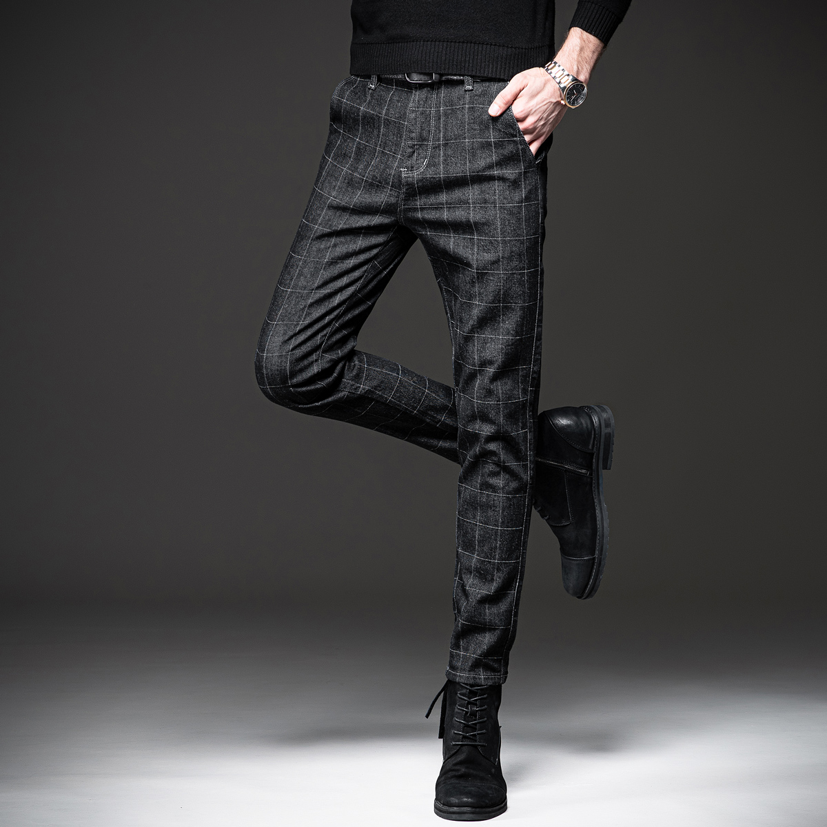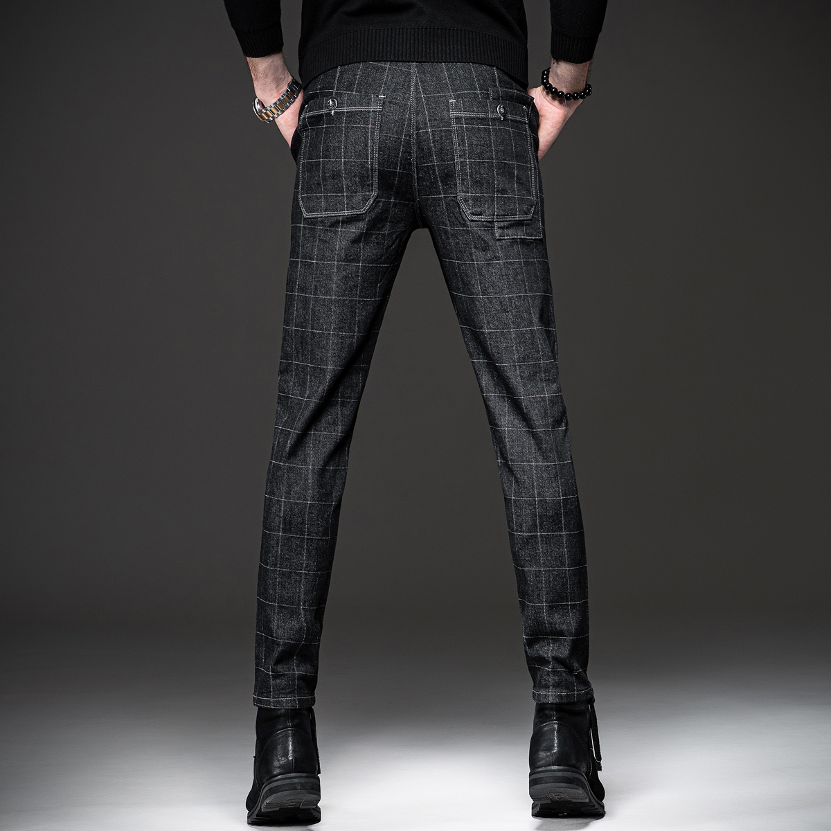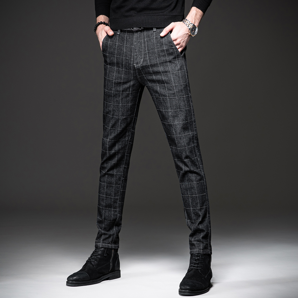 Men's Plaid Jeans Straight Slim Skinny Pants Trendy Brand Korean Style Trend Versatile Black Men's Casual Trousers