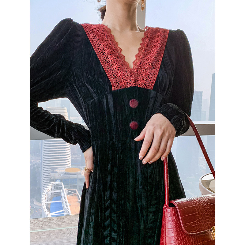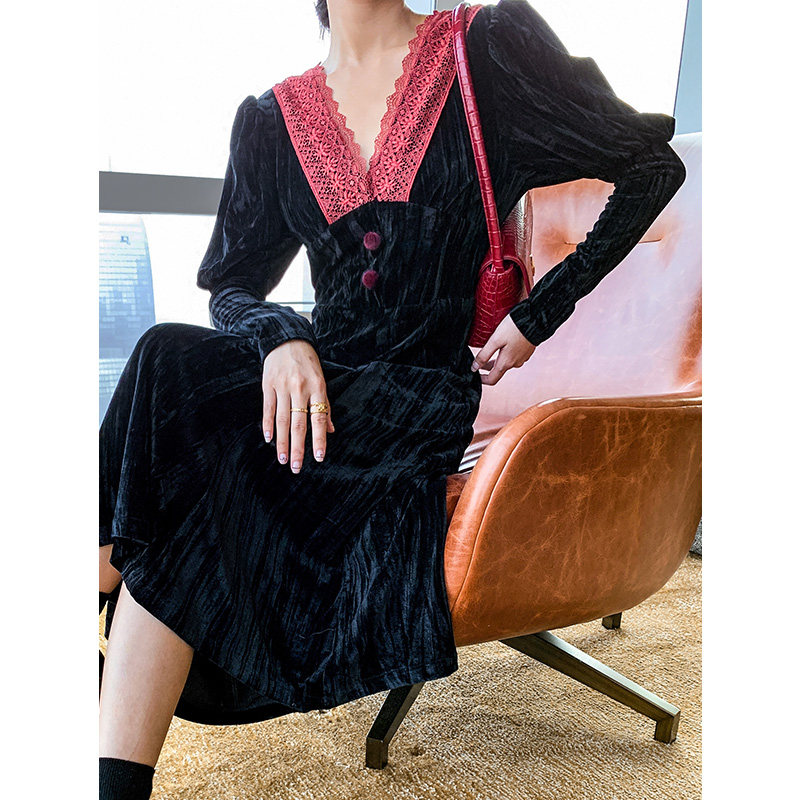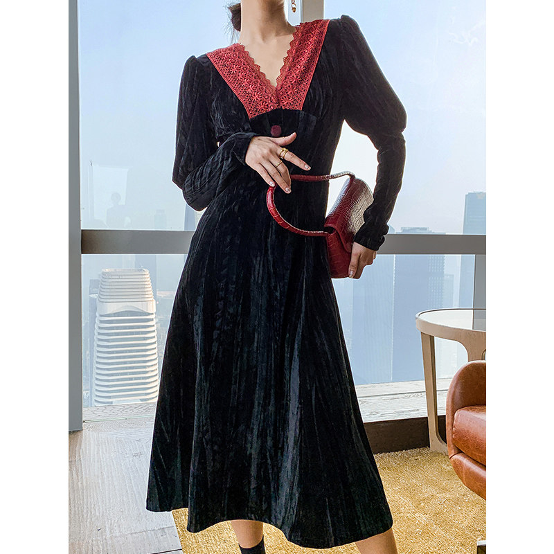 Light luxury Yuan V-leading French Renaissance Fall and Winter Harvest Little Shangche Ben Wind Black Dress