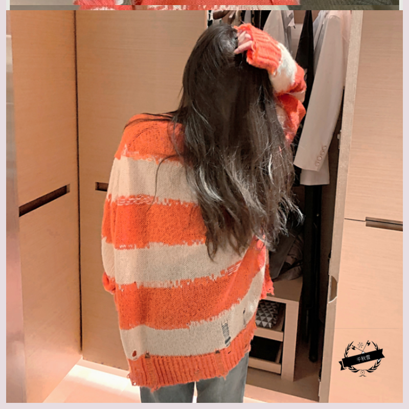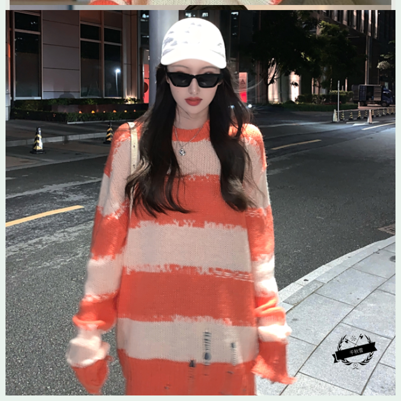 Gentle wind autumn female ins temperament striped mohair knitwear fashionable hole sweater loose pullover