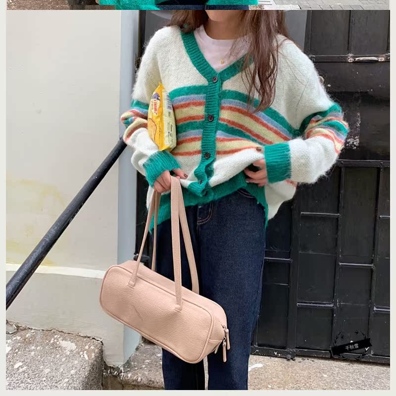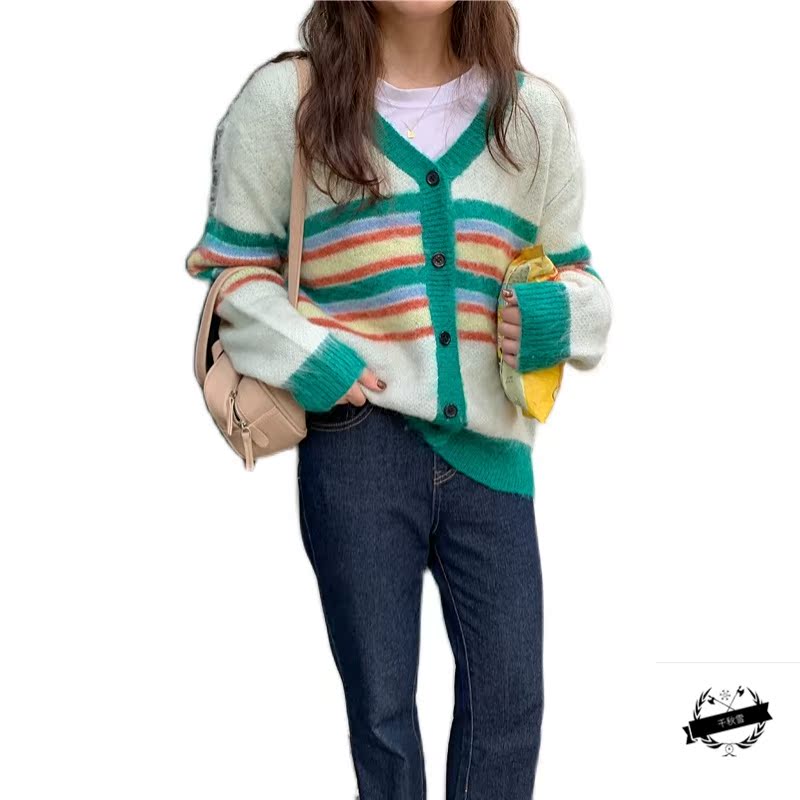 College style lazy contrast striped knitted cardigan women's 2021 autumn Korean edition loose casual small fresh short coat