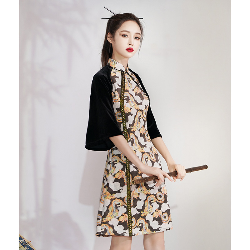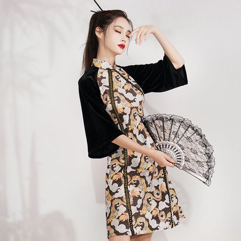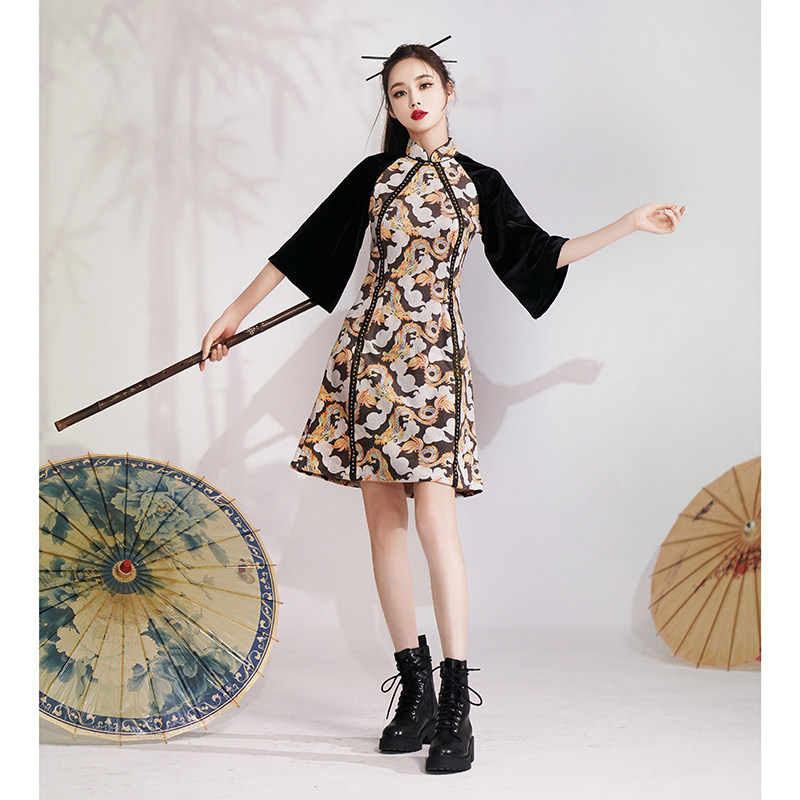 Daily cheongsam 2021 new spring long-sleeved Chinese style young girl improved version short sexy dress