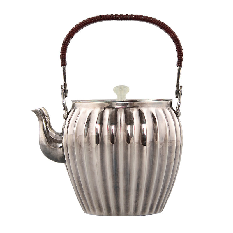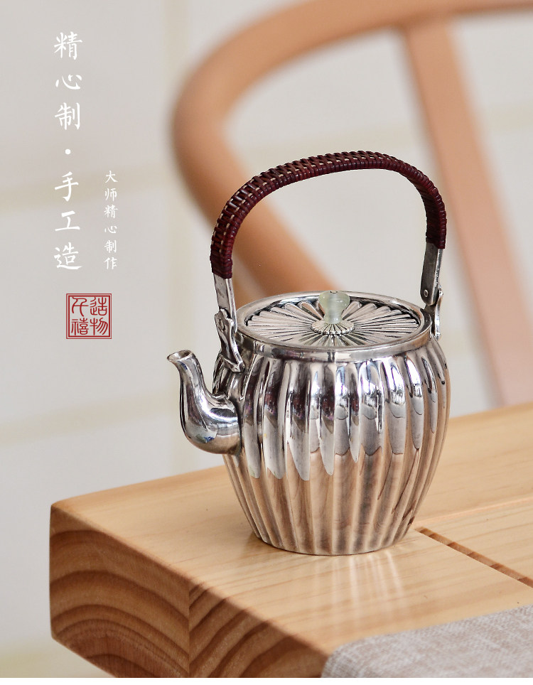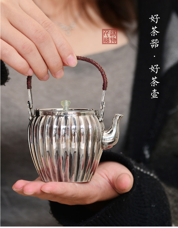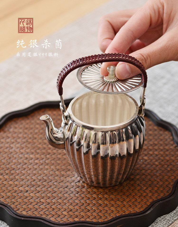 Silver pot 999 sterling silver bubble teapot foot silver handmade melon petal retro Japanese kung fu home boiling water lift beam small pot