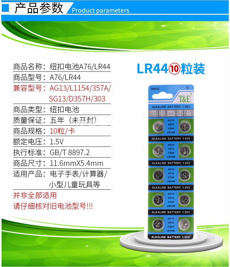 LR44 button battery AG13 L1154 A76 357a SR44 electronic watch 1 5V toy remote control