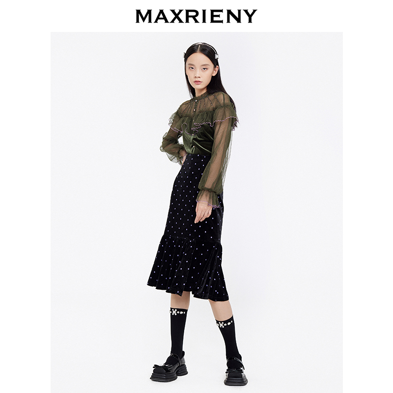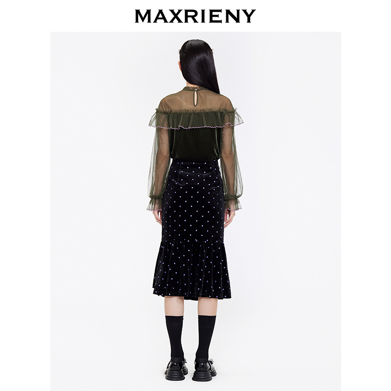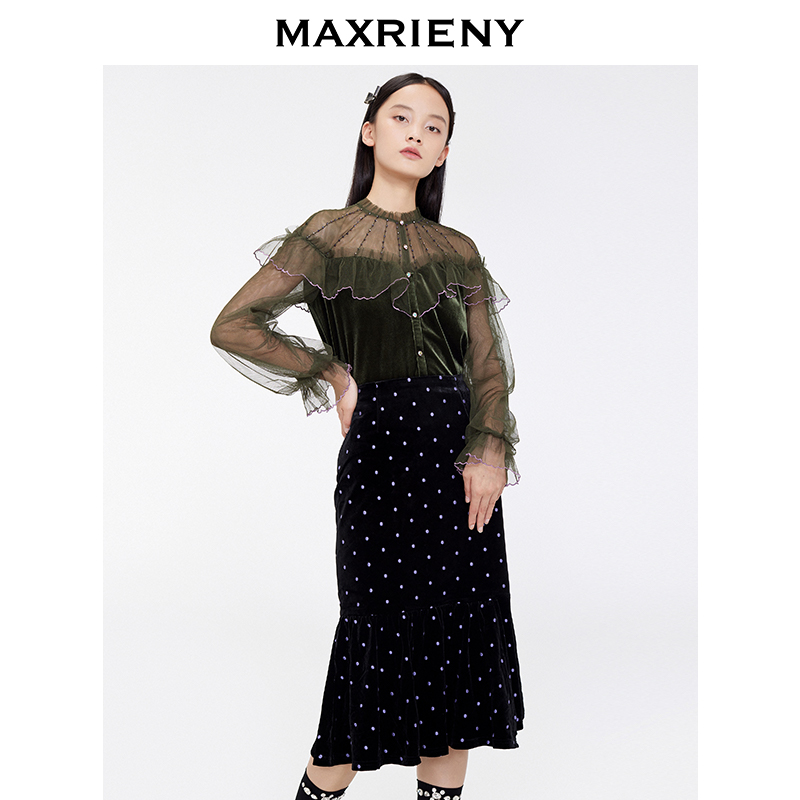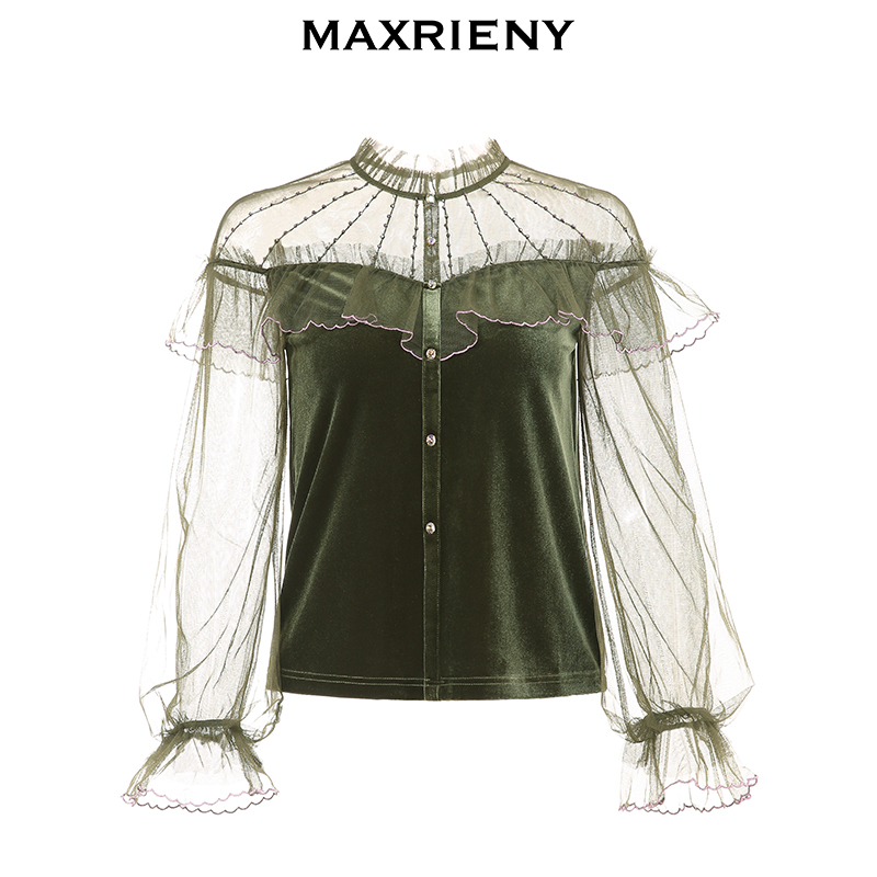 MAXRIENY2020 Winter new retro pure color upright collar Lotus Leaf with Horn Sleeves Mesh Veil Cardiovert Blouse