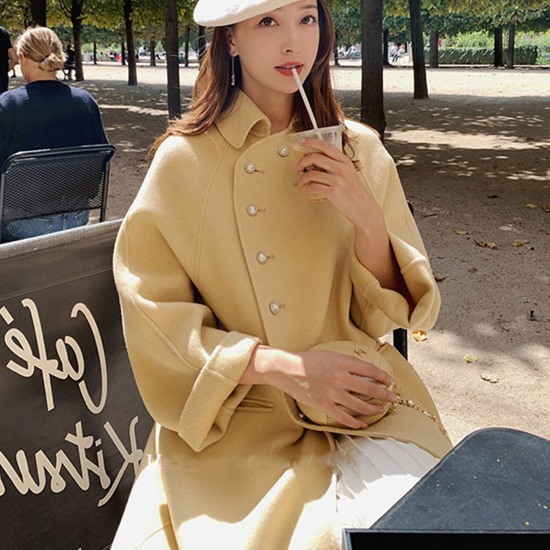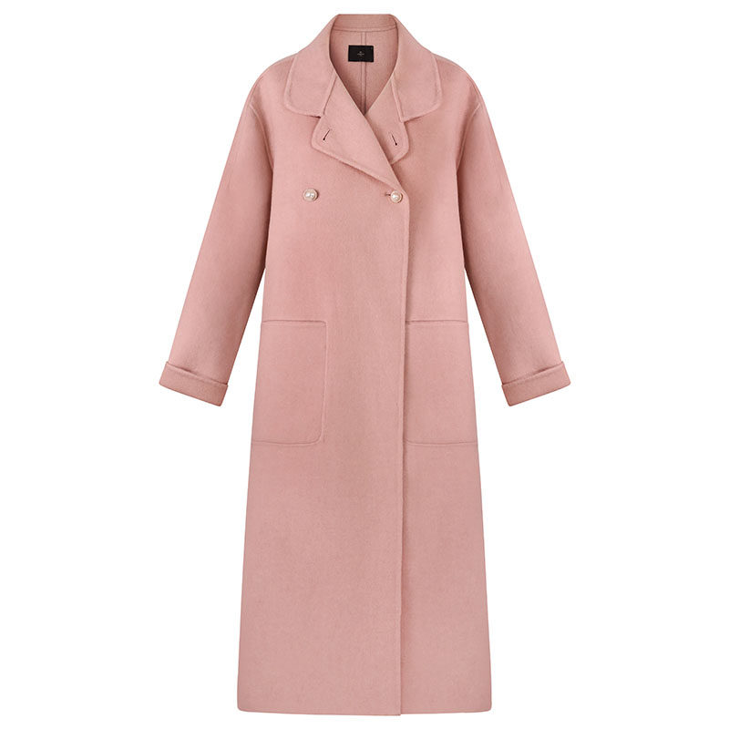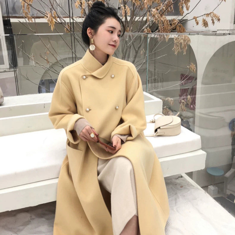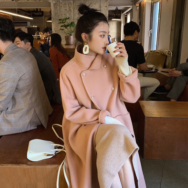 Double face cashmere big coat woman medium long version 2020 autumn winter new over kneecap Knee Temperament Pearl Buckle High-end Wool Coat