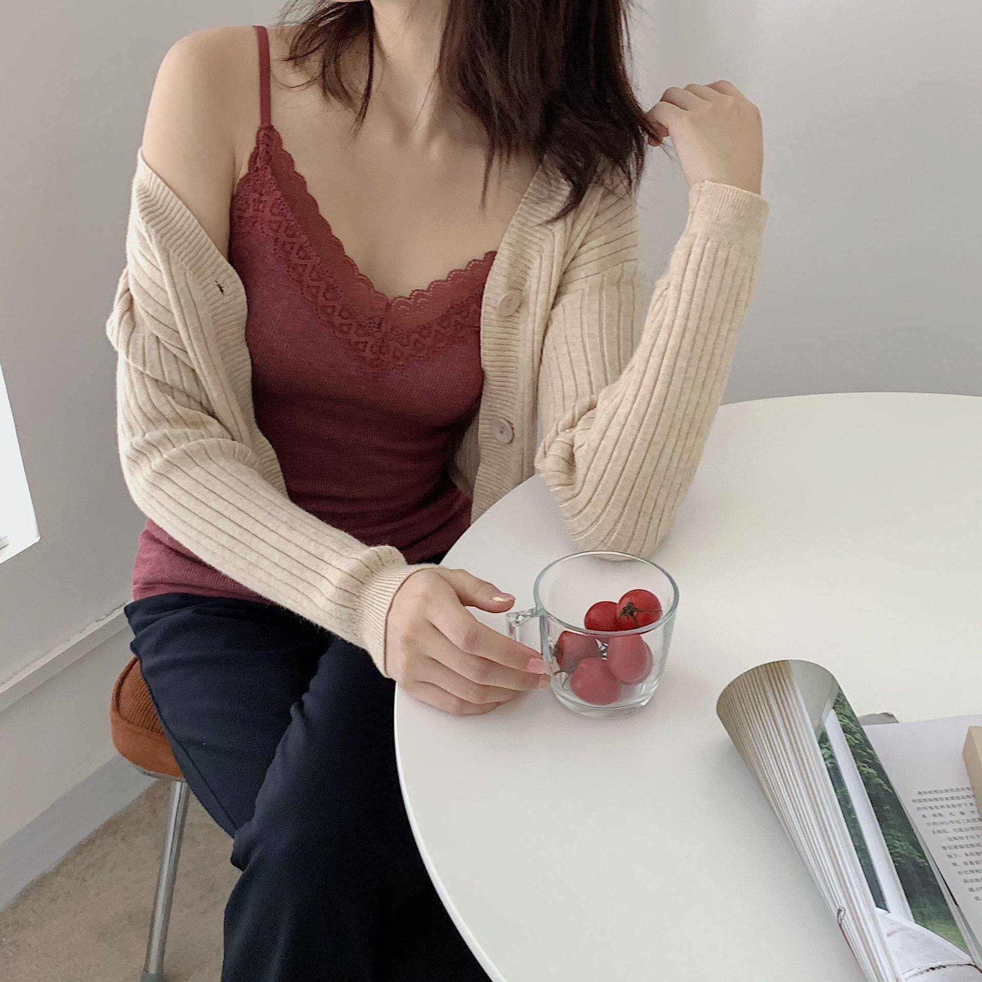 Bra-free velvet heating Japanese round neck cotton lace terry thickened warm camisole base shirt