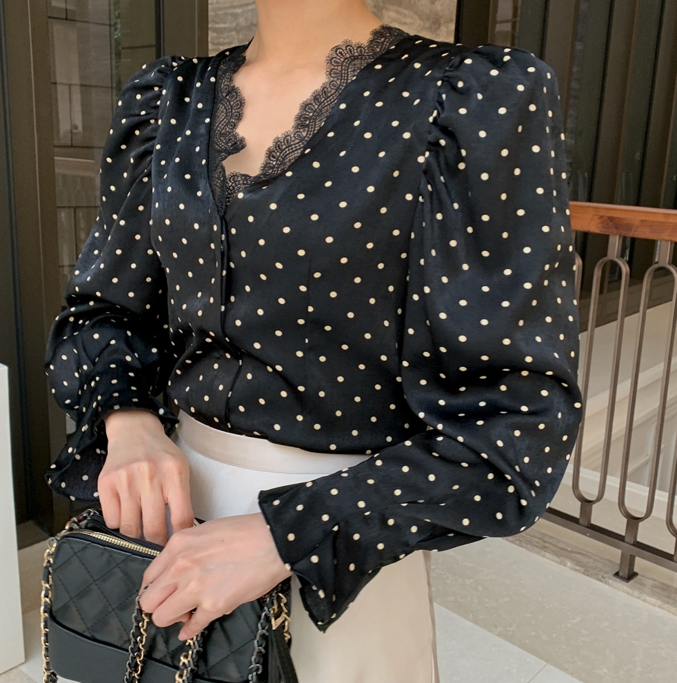 Slightly lace V-collar sleeved shirt female spring new shirt pinched shoulder coat OL Korea