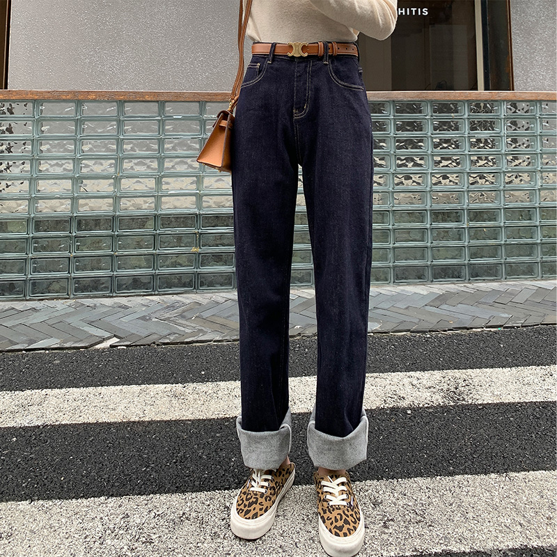 (Huchu hours light) 2021 Autumn winter clothing new dark blue jeans High waist loose straight drum pants women
