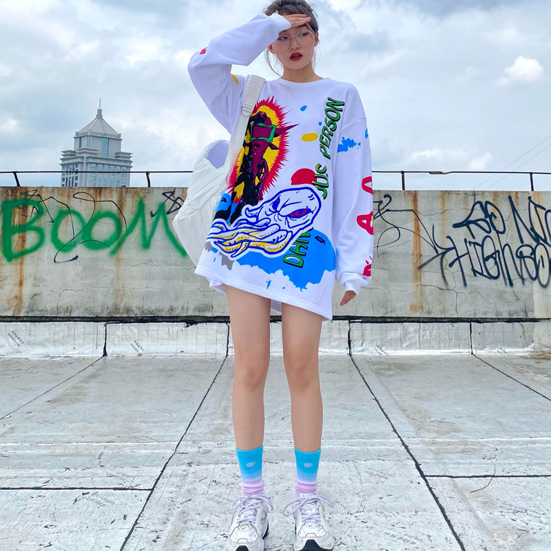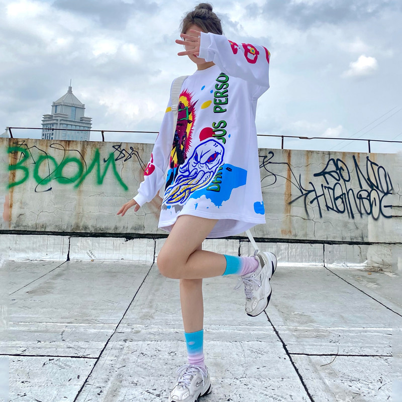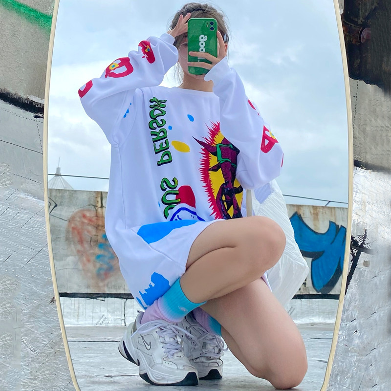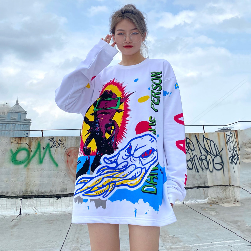2022 new trendy brand loose fashion round neck white sweater women's design sense niche graffiti print mid-length top