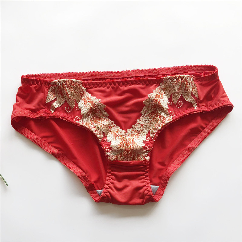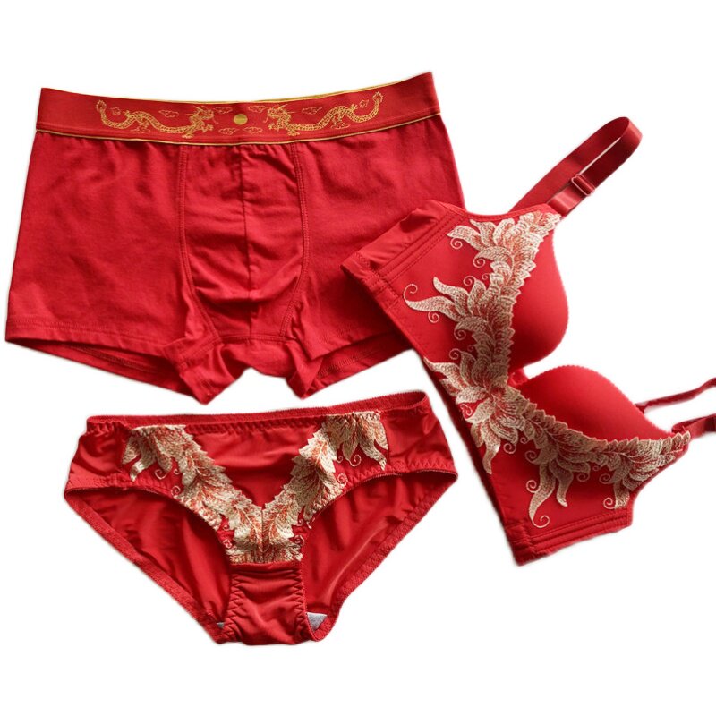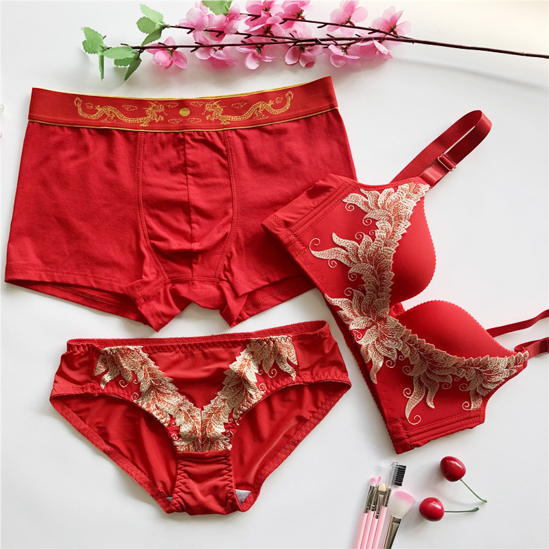 Big red underwear suit married bride groom couple underwear three pieces with bras and bras pure cotton