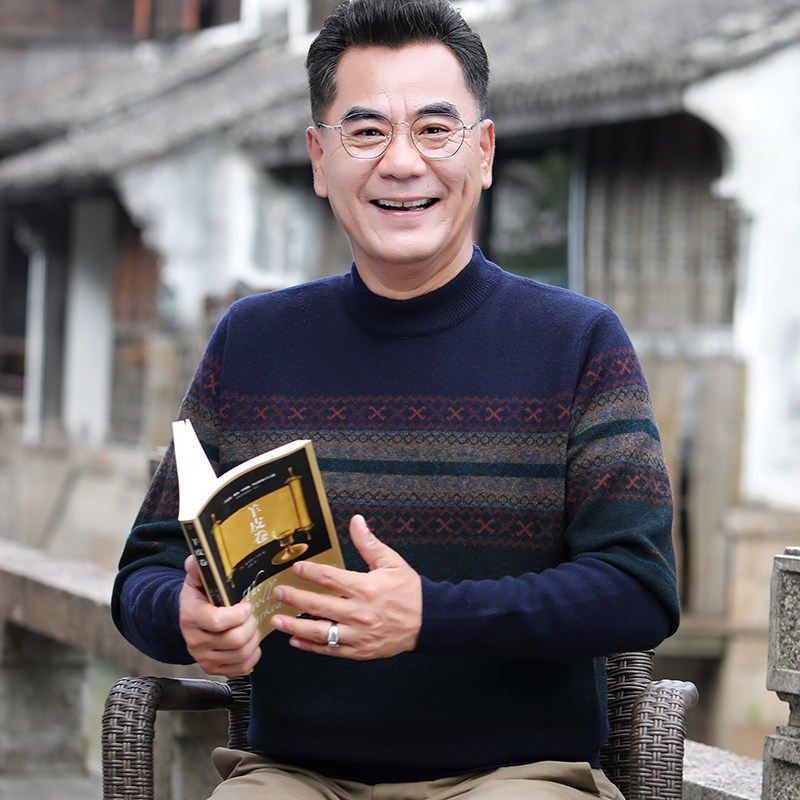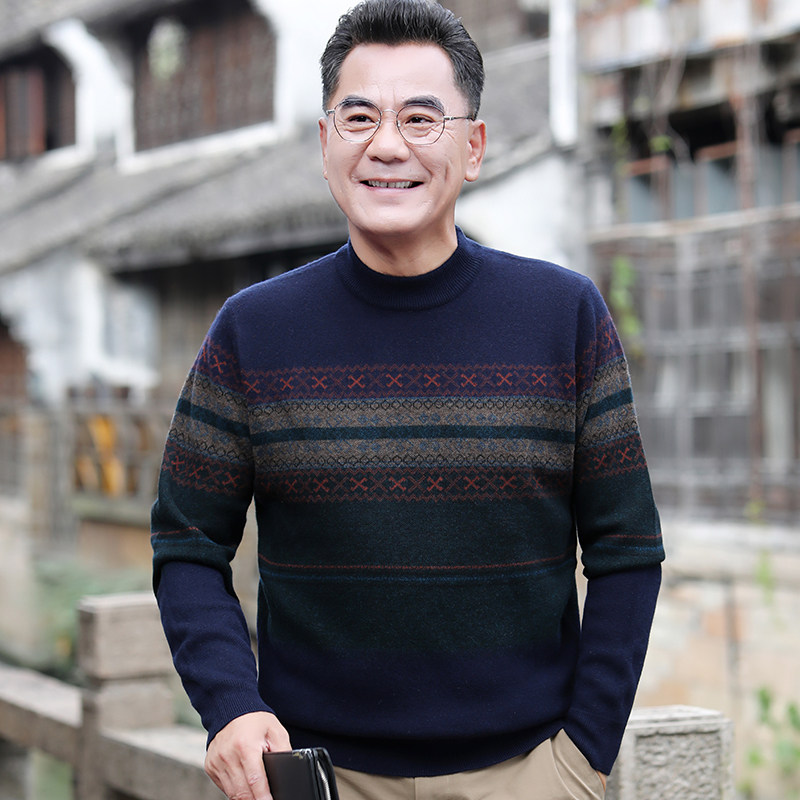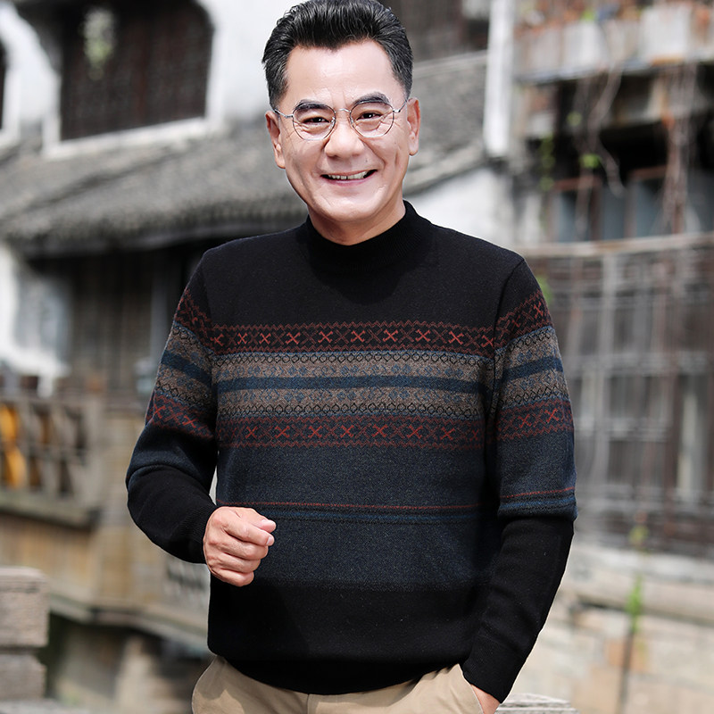 Men's goat sweatshirt 100 pure wool autumn and winter in old age daddy winter dress jacquard semi-high collar sweaters undershirt-Taobao