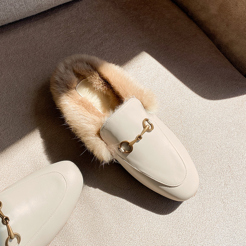 Baotou Mao Mao Shoes Half Slippers Women's Outer Wear Horse Street Buckle Bag Heel Leather Versatile Flat Muller Shoes Autumn and Winter Single Shoes