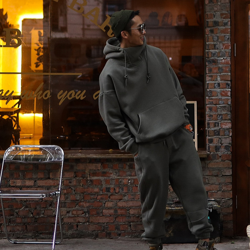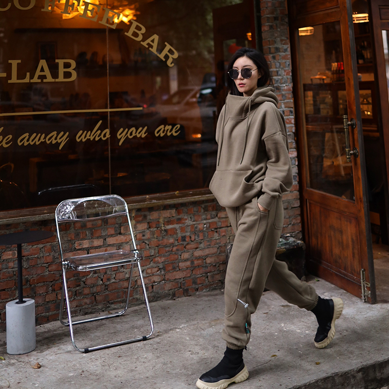 GUNCHILL2021 Spring Warm New Couple Retro Solid Color Plus Velvet Stand Collar Off Shoulder Hooded Sweater Set