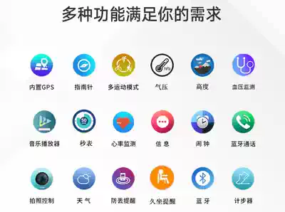 24-hour indication Alarm Calendar Speed measurement Height measurement Temperature measurement Air pressure measurement Weather forecast Compass function GPS Heart rate measurement Luminous Waterproof and shockproof Other