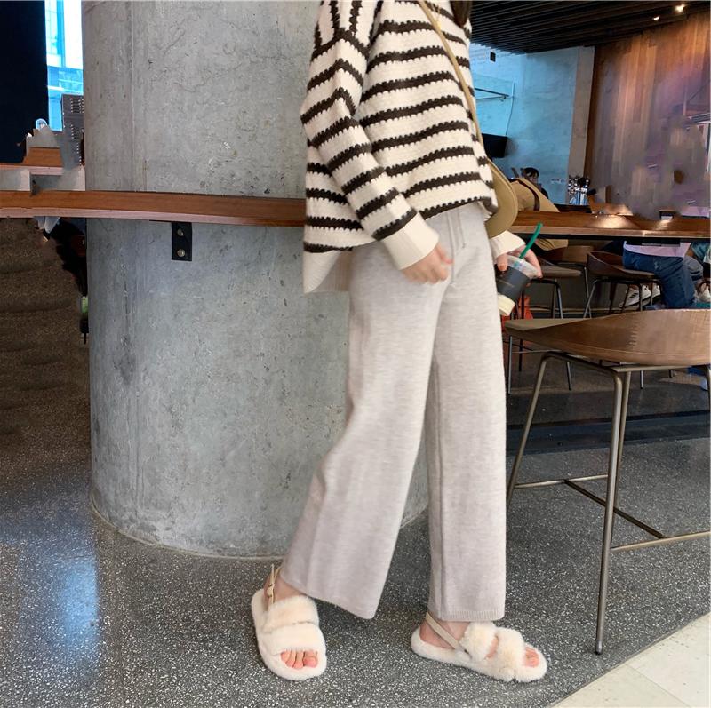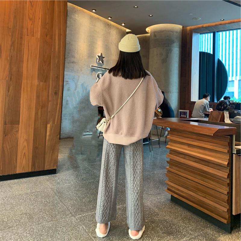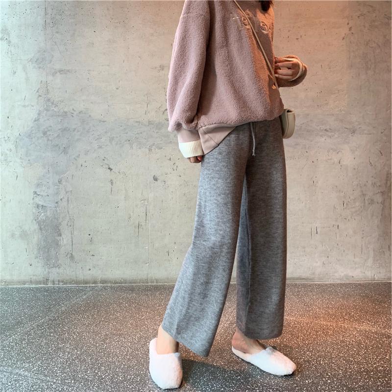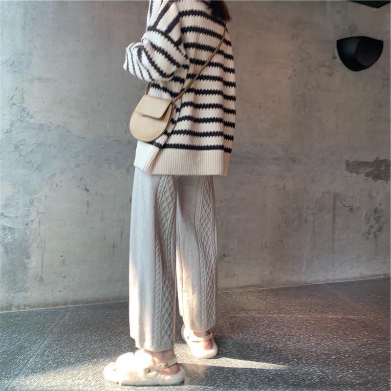 Pants women's autumn and winter college style elastic waist thin all-match loose high waist straight twist casual knitted wide leg pants
