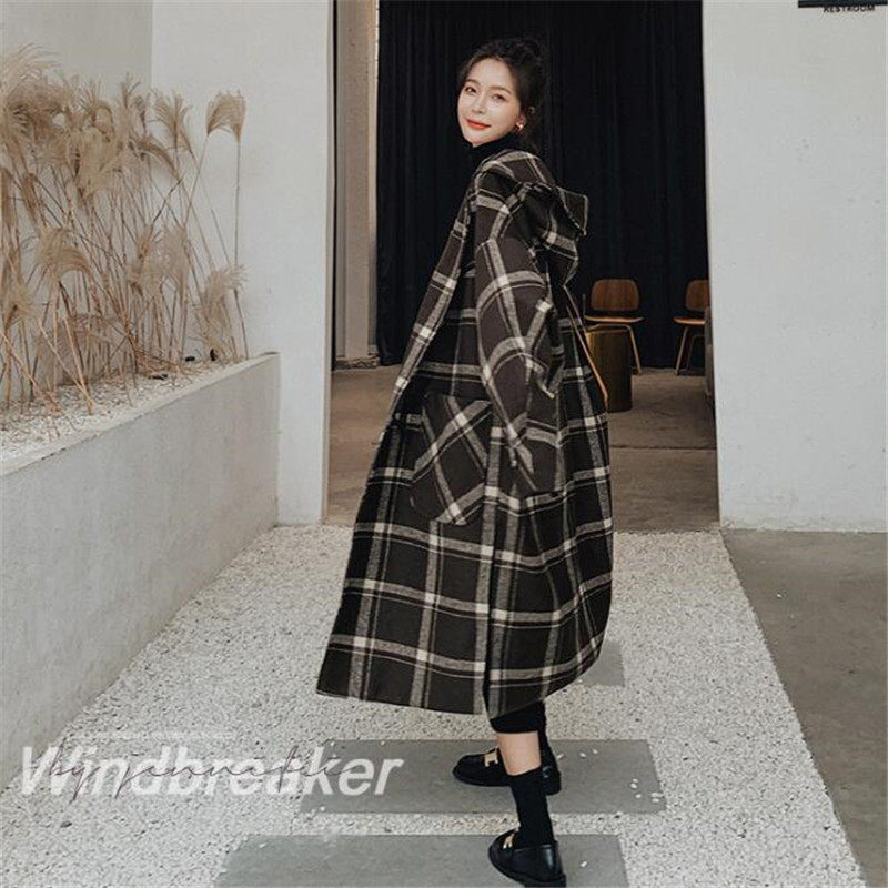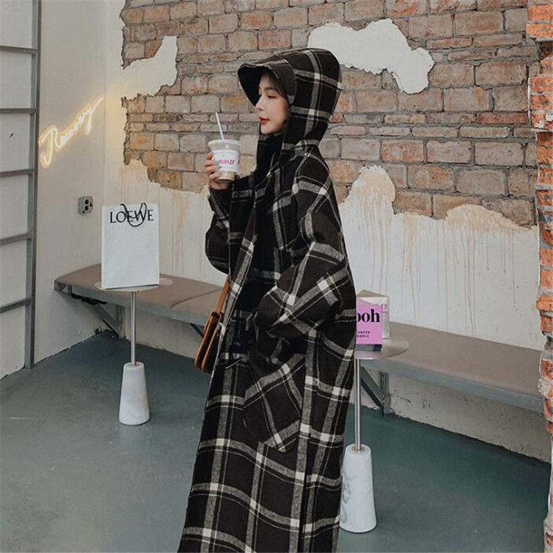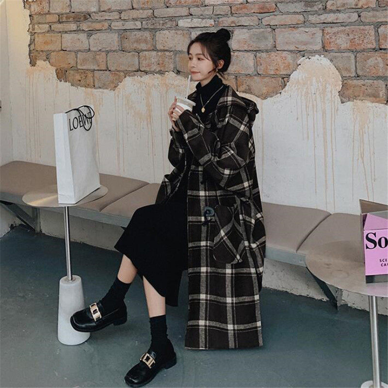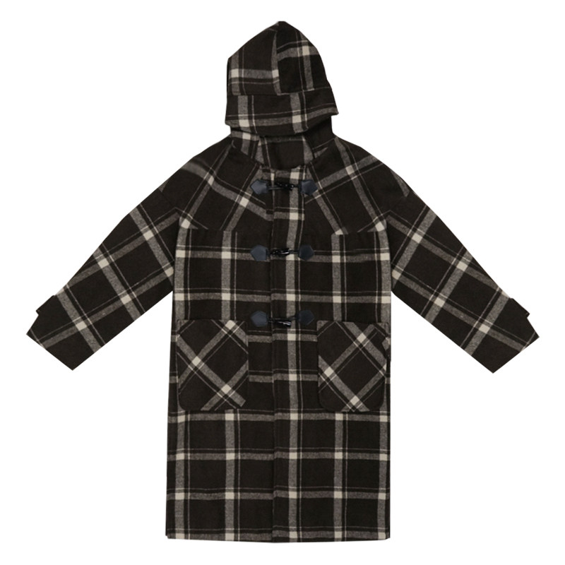 VOGCHAR 2021 autumn and winter retro Hepburn style horn buckle plaid woolen coat female Korean version mid-length temperament