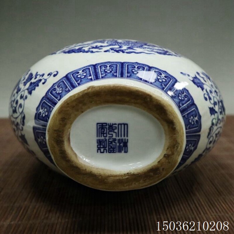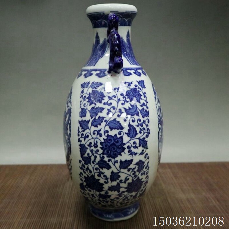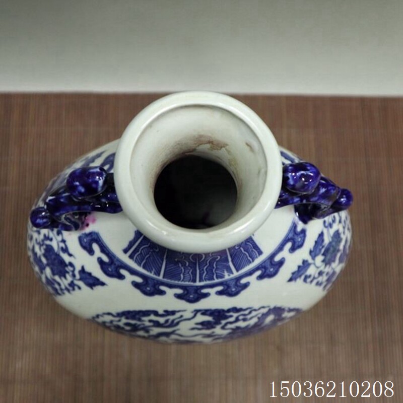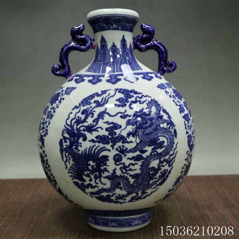 Antique ceramics Old goods blue and white ears dragon Phoenix flowers and birds flat bottle flower arrangement Chinese home office decorations