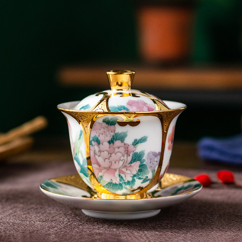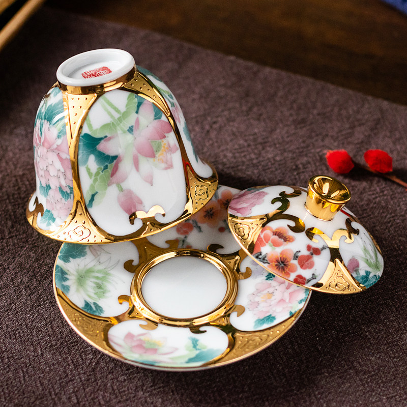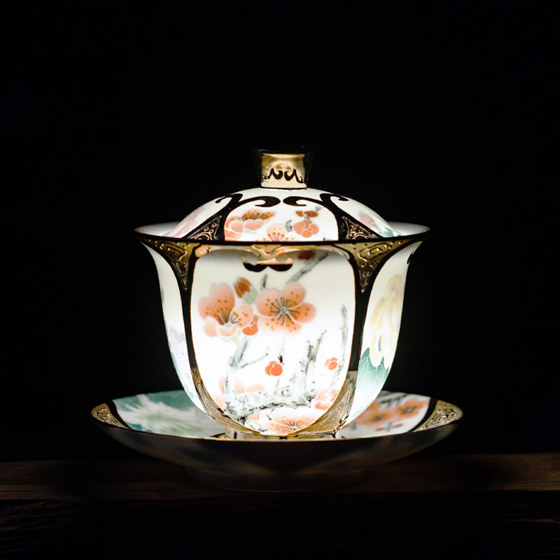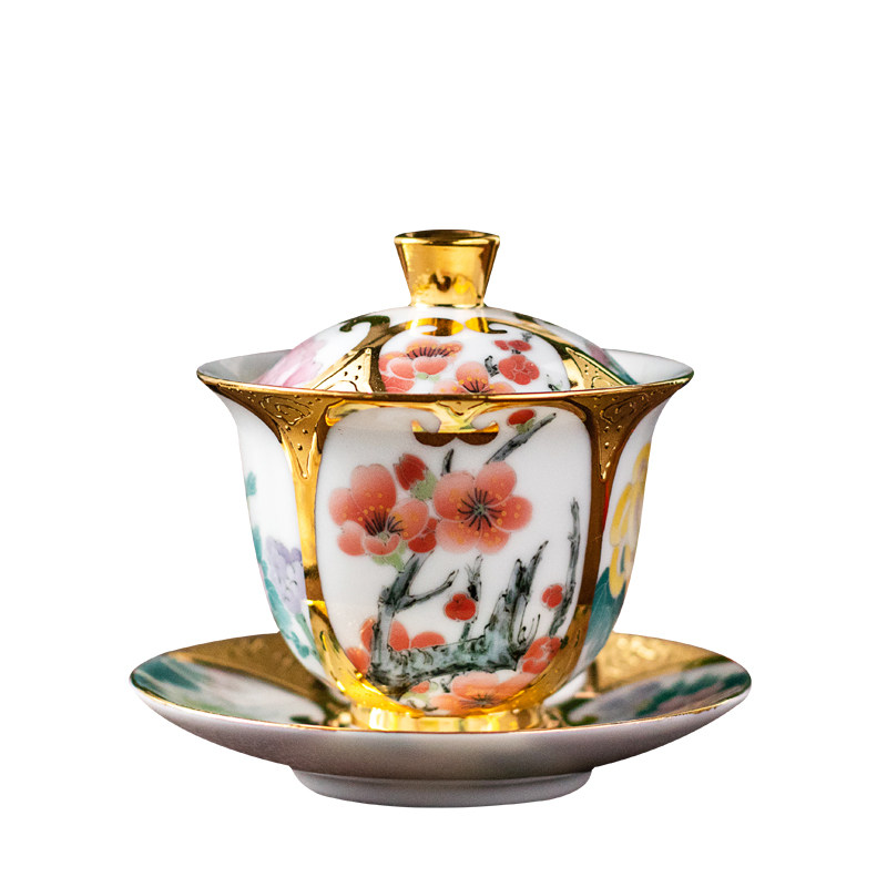 999 True gold on four sides open window with hand-painted white gold porcelain founder Xiao Jianhui Four seasons three only cover the bowl of tea cup 160cc