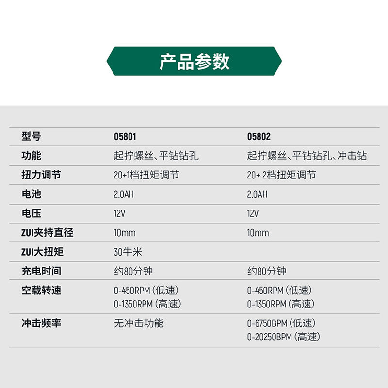 05801 05801 (12V brushless lithium electric drill) (containing a battery one charger) 05802 (12V brushless impact lithium electric drill) (containing a piece of battery a charger