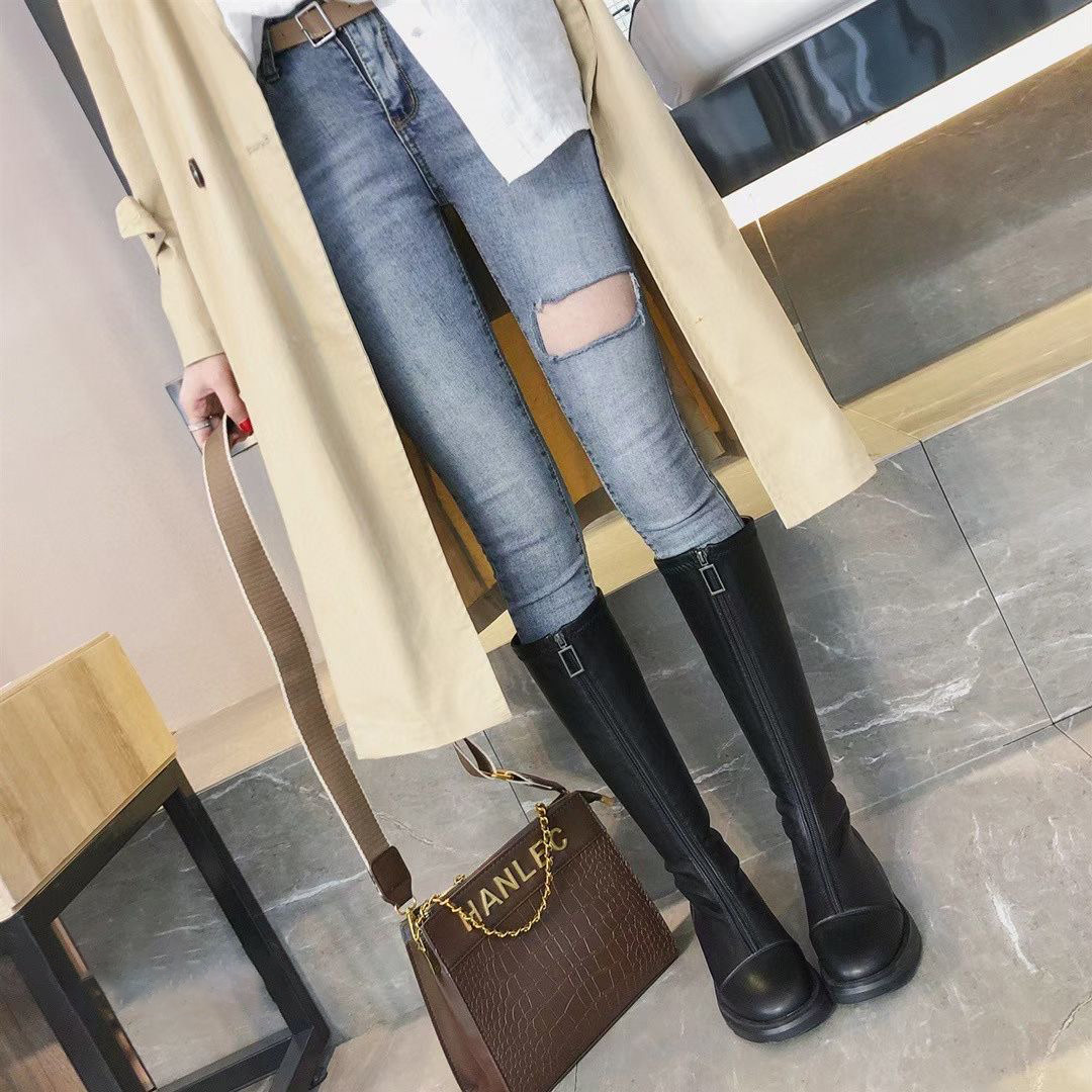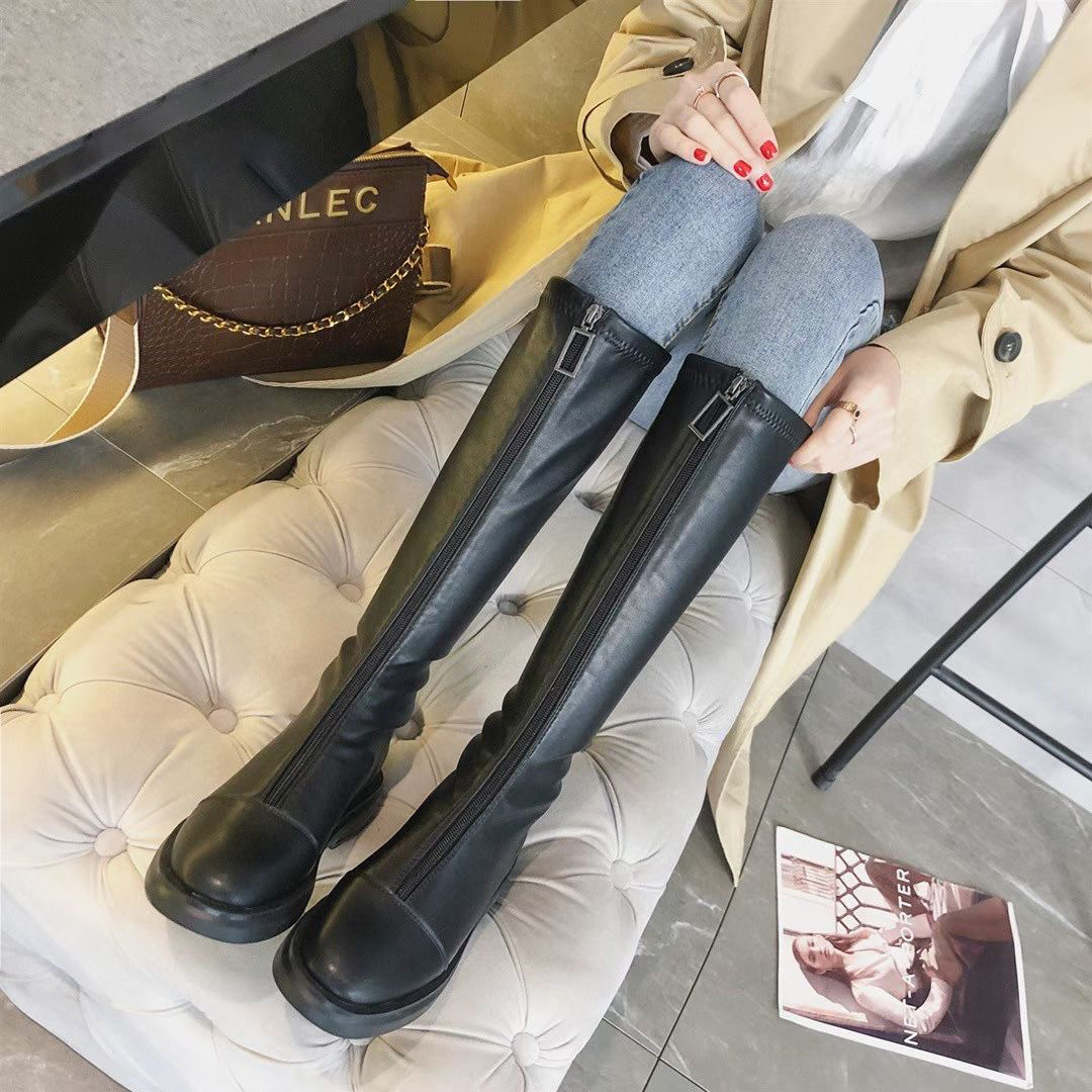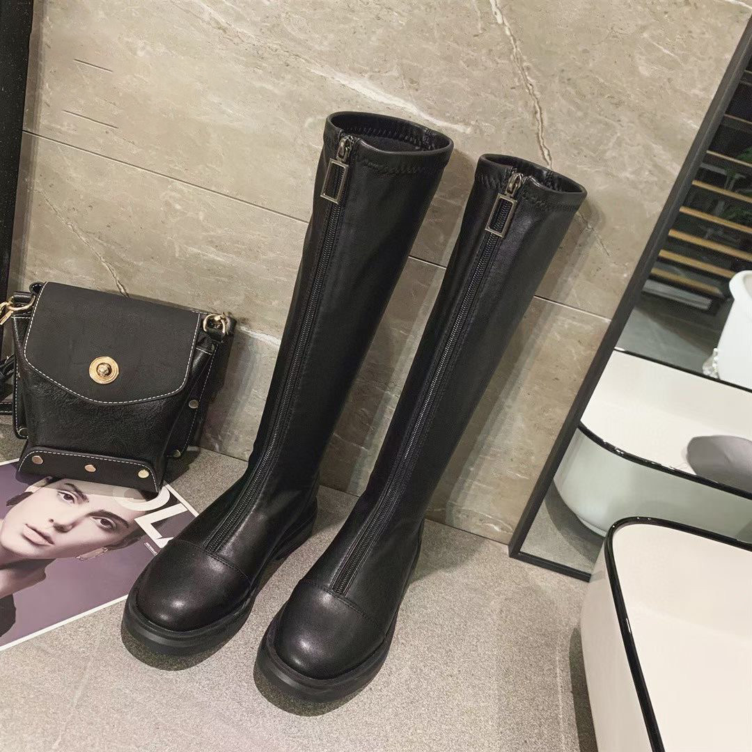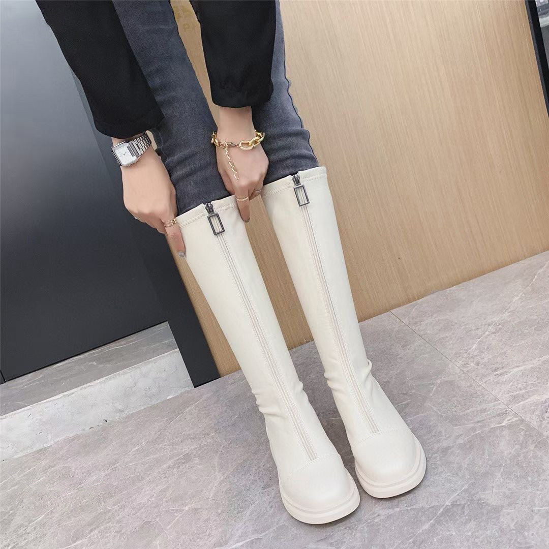 Boots woman rice white front pull chain medium-high cylinder boot with small elastic small sub-long boot female though kneecap
