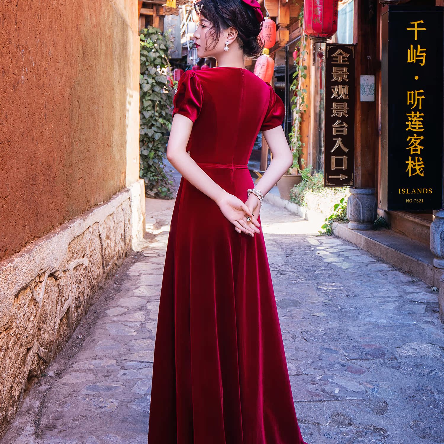 Toast to the bride 2021 new small subreddits slim V neckline red velvet red velvety banquet evening gown