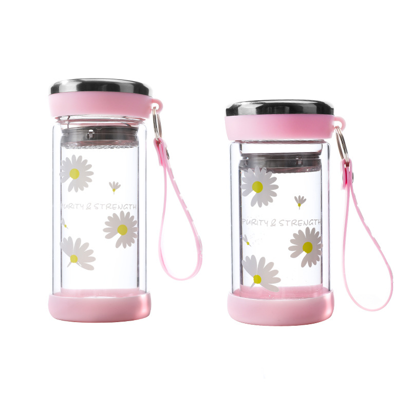 Small daisy double-layer glass with cover net red water cup cute female student drinking cup round portable carry rope