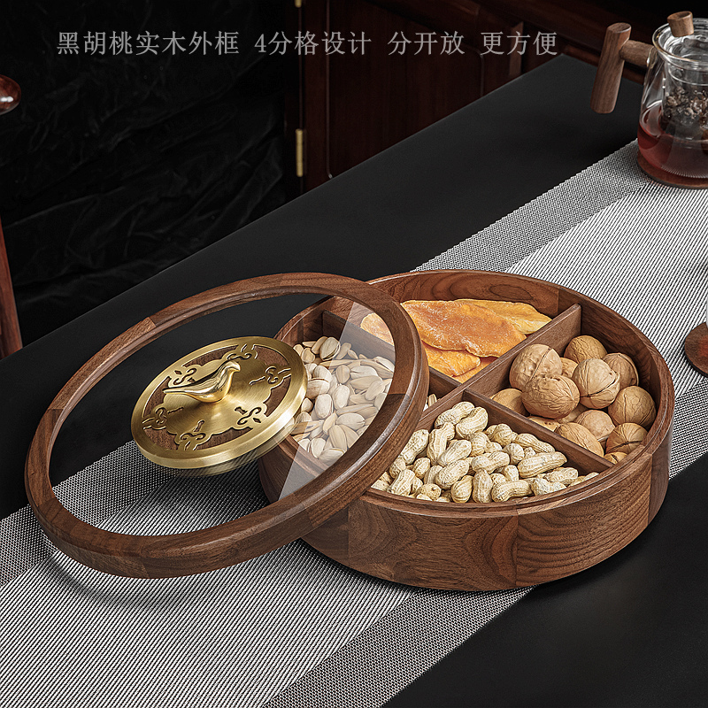 Black walnut solid wood dried fruit box compartment with lid candy box home Chinese living room snack plate nut plate storage box