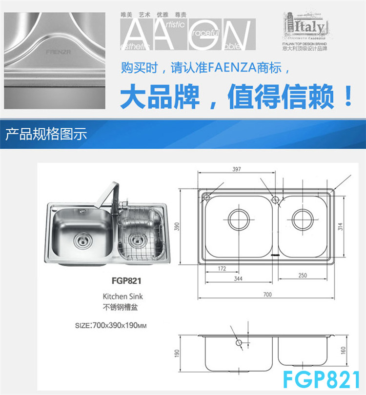 Faenza kitchen sink double sink thickened 304 stainless steel sink sink FGP821