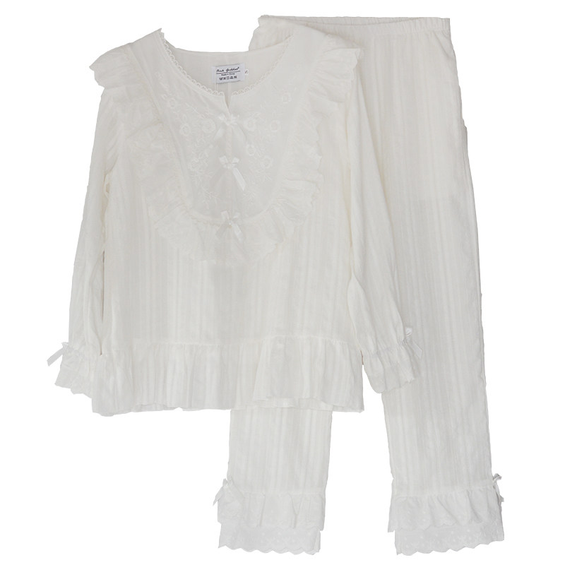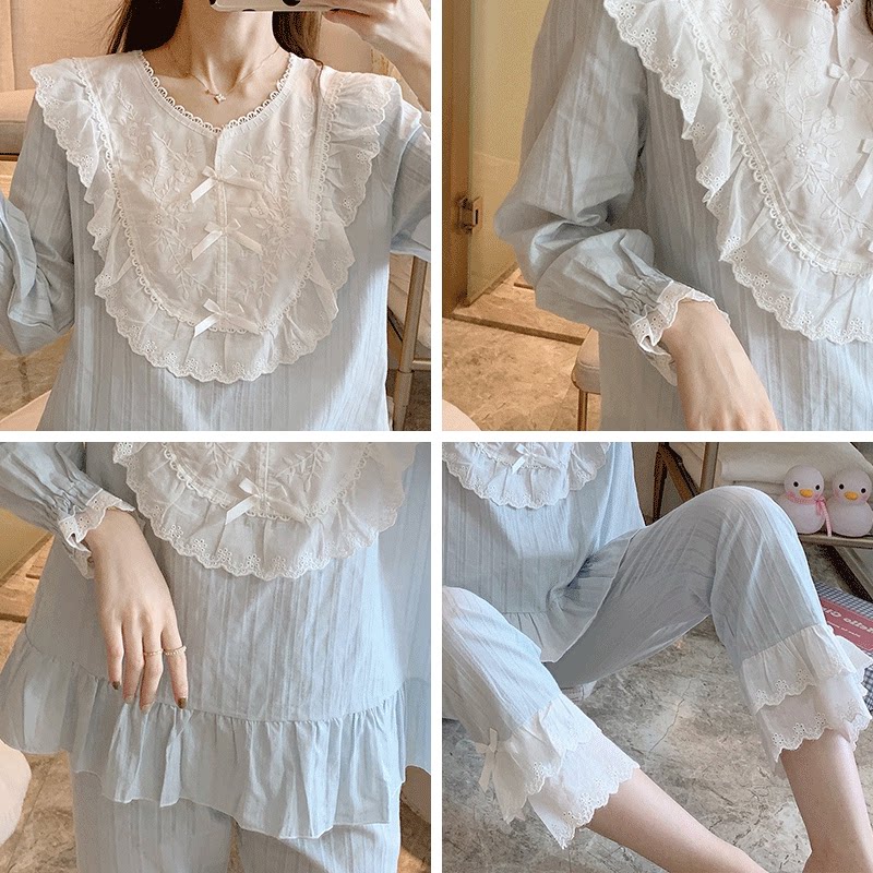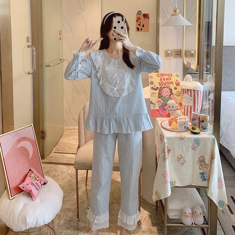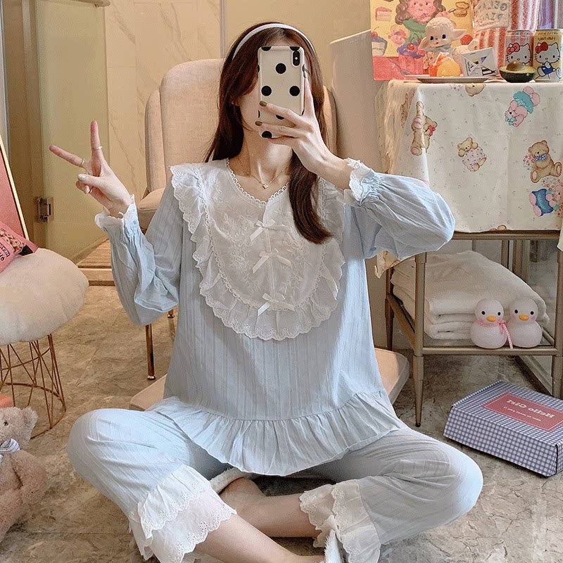 Long sleeved spring and autumn pajamas, women's cotton summer trousers, casual lace palace style home wear, two suits can be worn outside