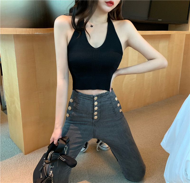 All-match short sleeveless top, high waist, navel, sexy hanging neck suspenders, Western style knitted vest, bottoming shirt, women's