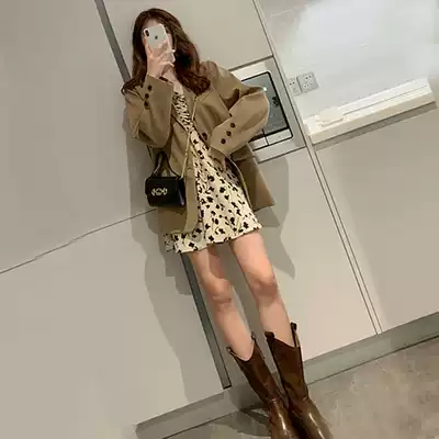 2021 spring and autumn new sweet little man waist slim V-neck bottoming skirt long-sleeved A-line floral dress short skirt