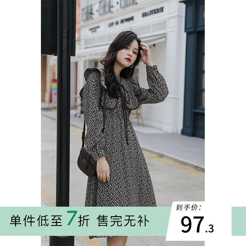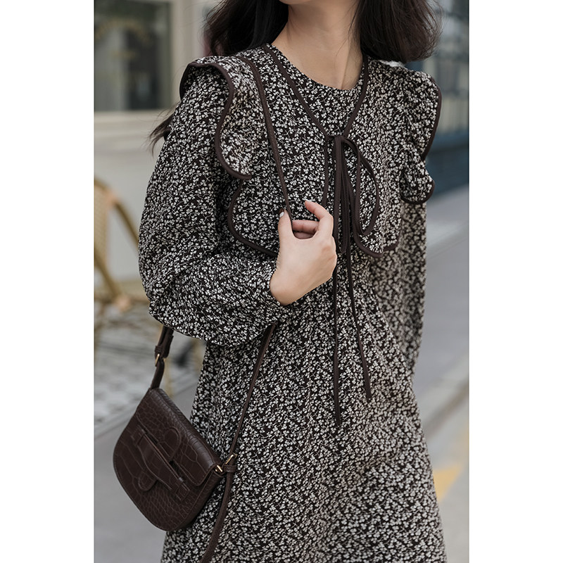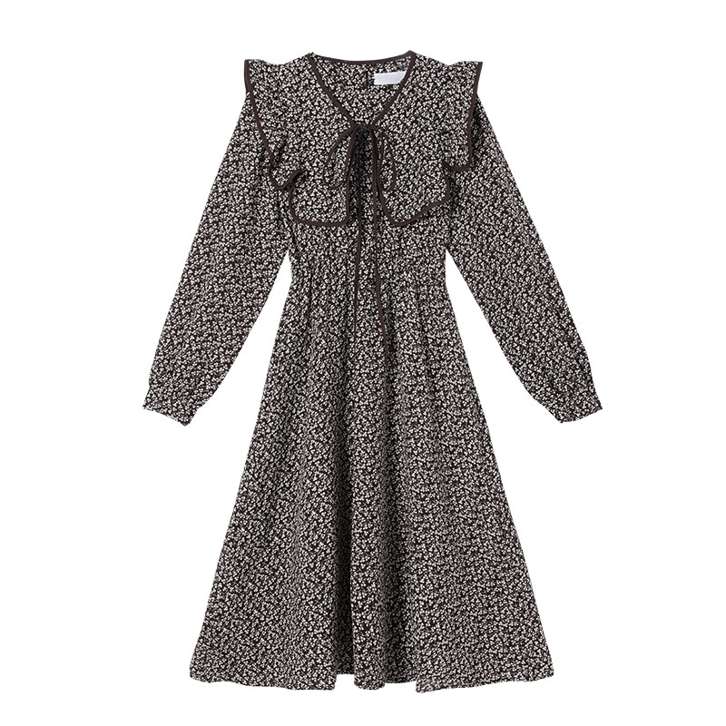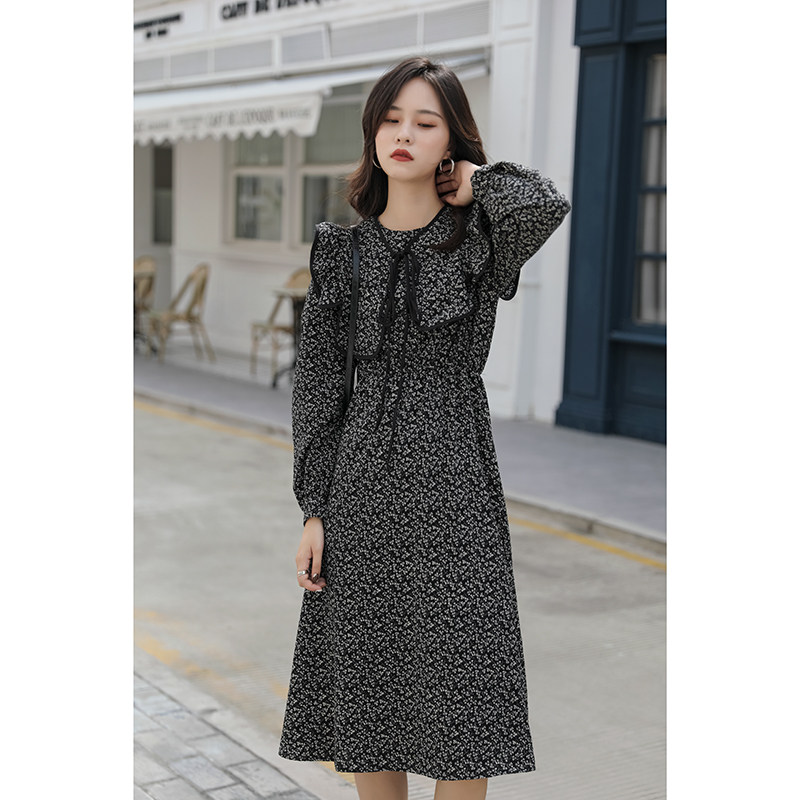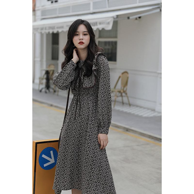 "Again Alley" crumbled with long sleeves for women 2021 new fall retro dresses V collar Waist Temperament Long Skirt
