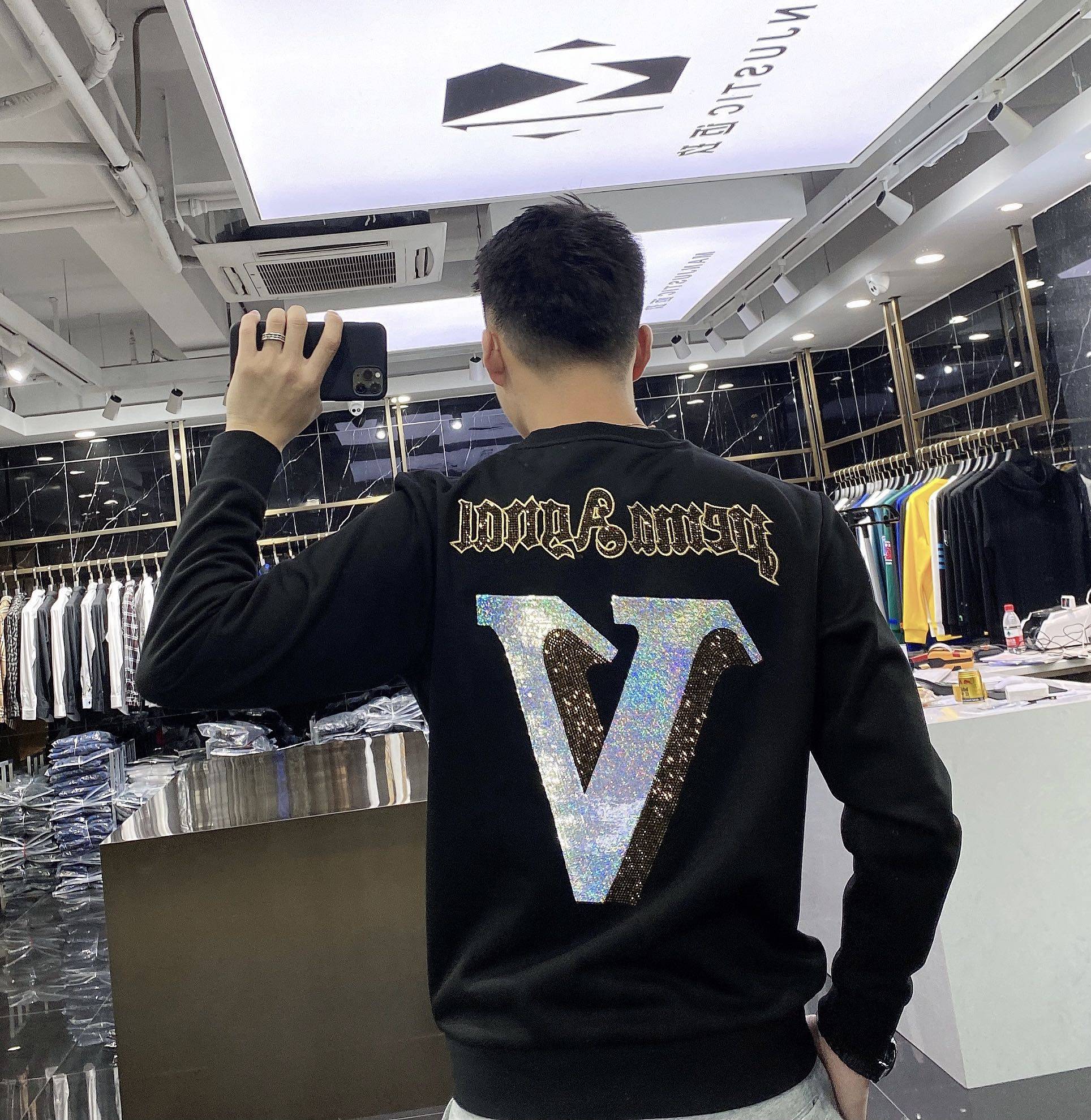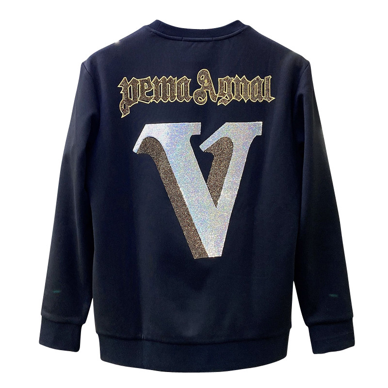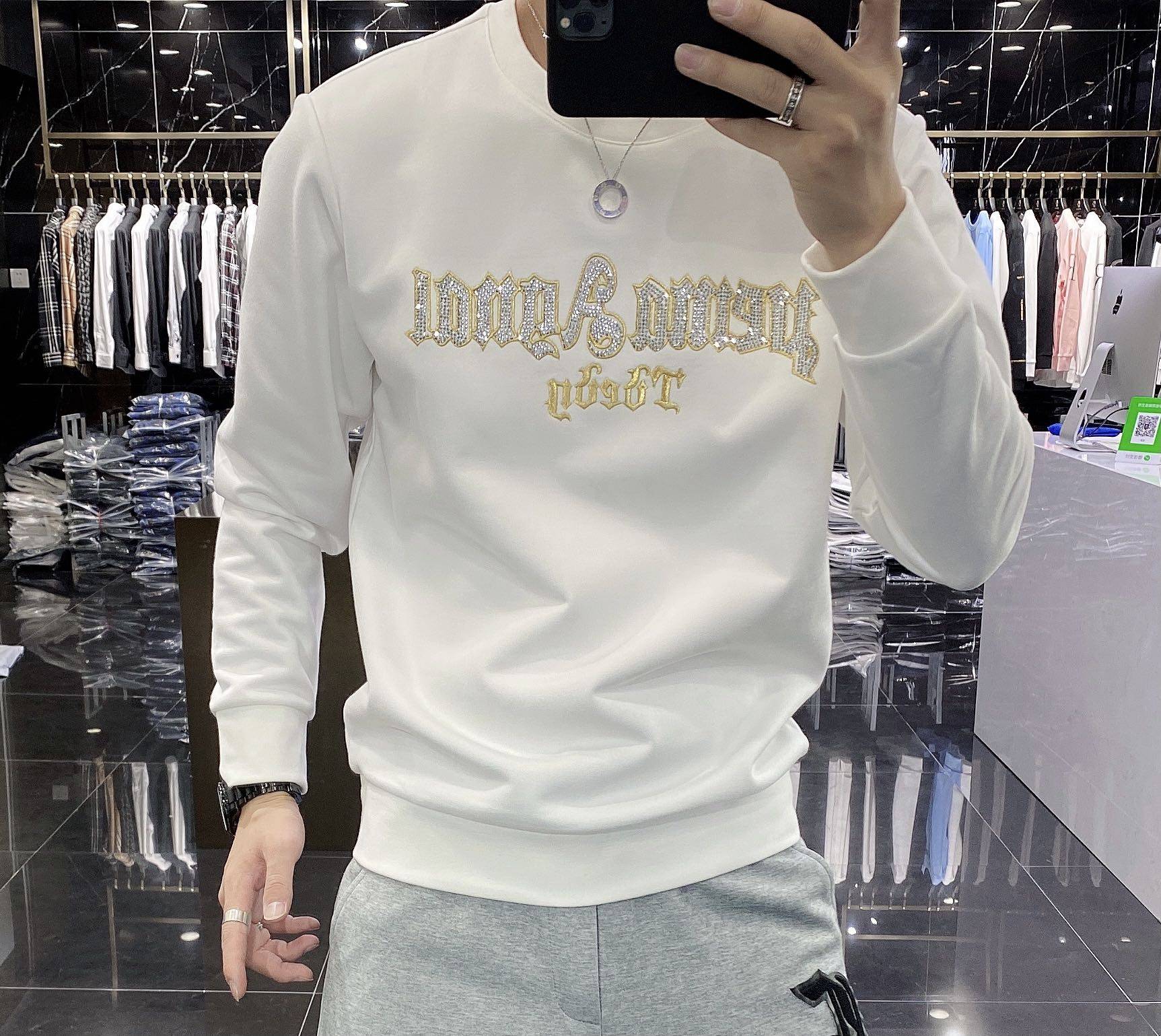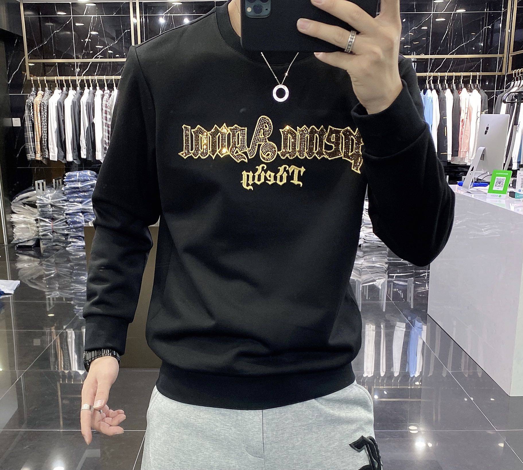 Han version of trendy clothing men's 2021 autumn and winter new pure cotton thick embroidery high-end round collar bronzed and drilling casual long sleeves bottom