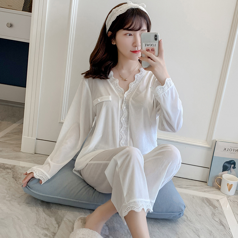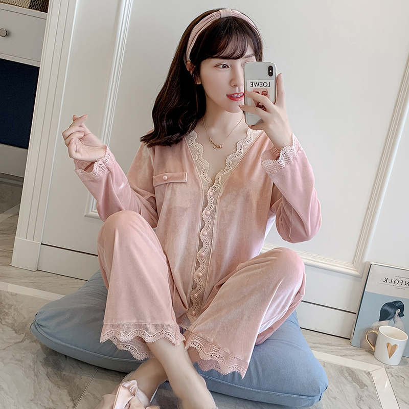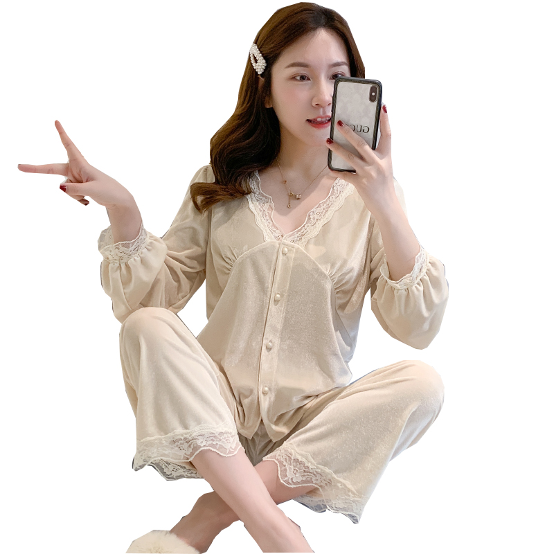 Pajamas women's autumn and winter sexy gold velvet long-sleeved net red lace two-piece suit can be worn outside home clothes women's spring and autumn