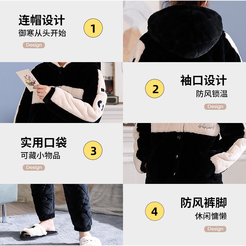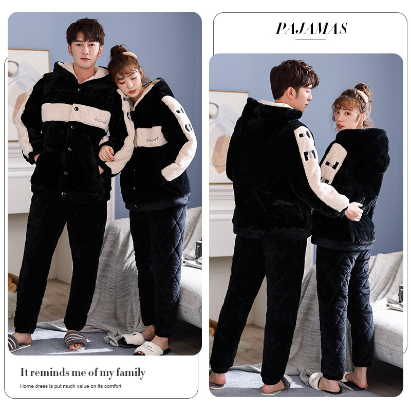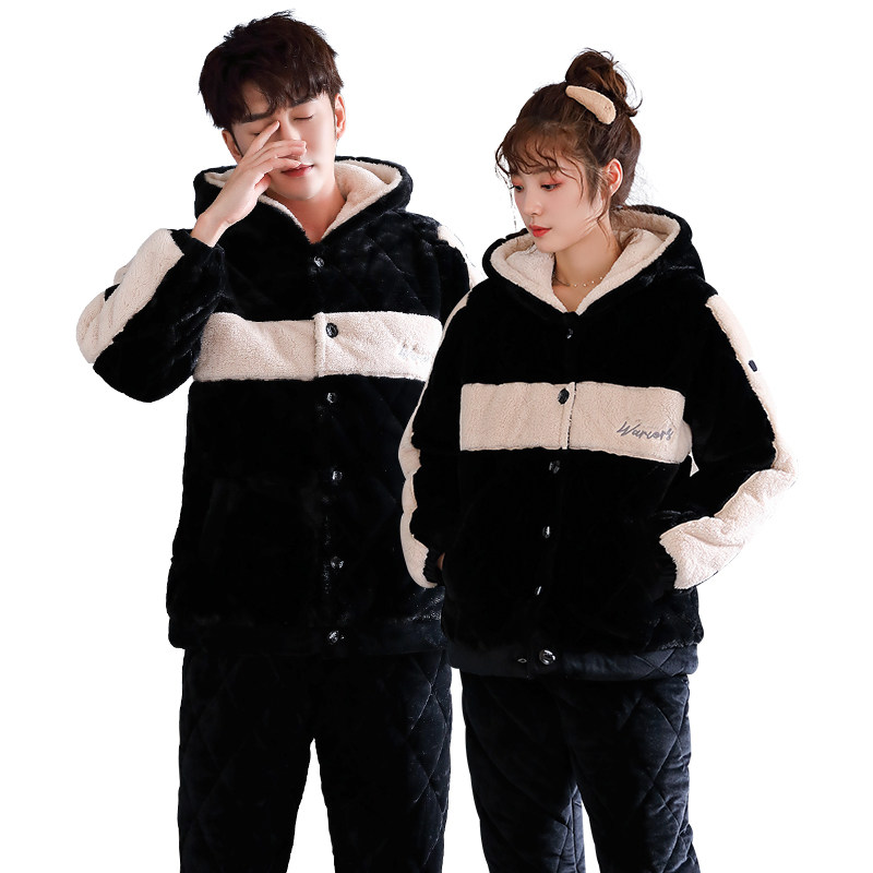 Couple pajamas winter coral fleece thickened plus velvet women's three-layer quilted hood can be worn outside men's home clothes winter