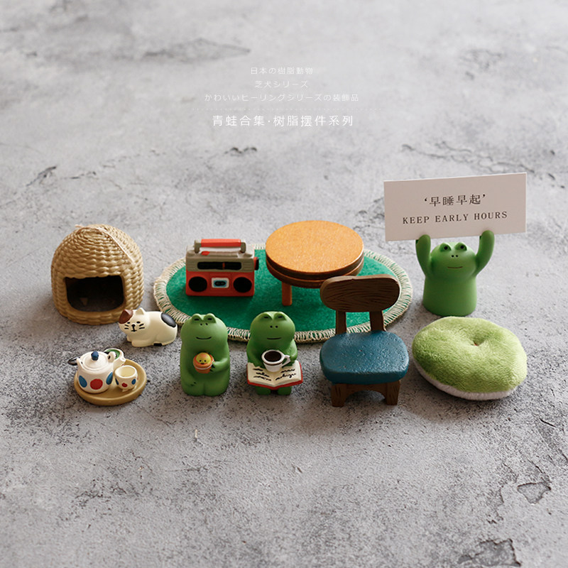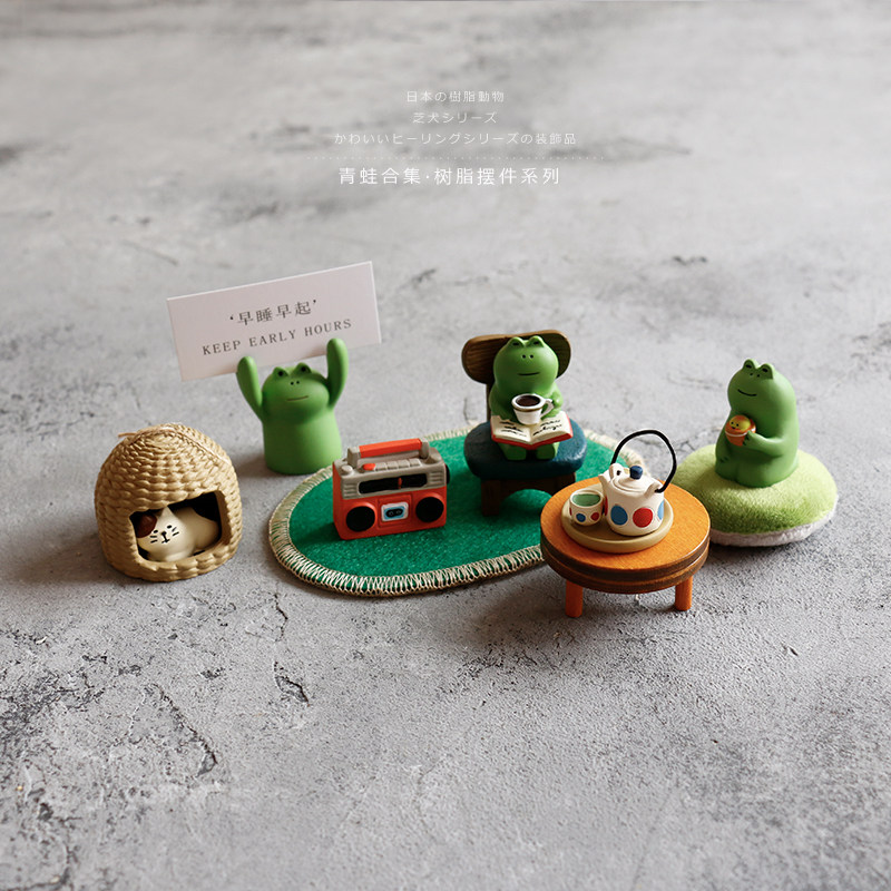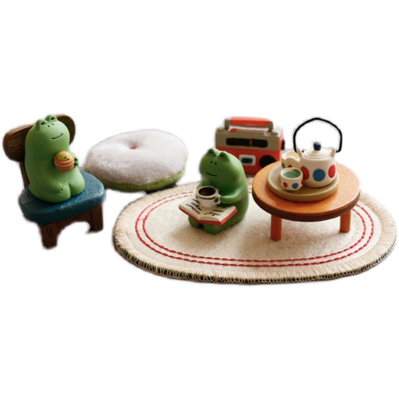 Blue rough wooden chair coffee frog round wooden table basket cat (can be taken out) color teapot green Japanese wind round cushion green carpet radio plum wine frog raise hand frog set combination (pieces into) 10