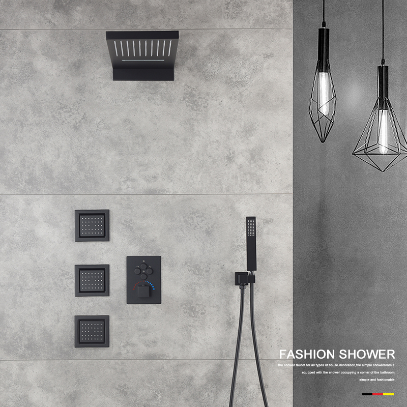 A- Black hot and cold suit (three functions) A- black hot and cold set with water outlet (four functions) B- black thermostatic suit (three functions) B- black thermostatic suit with the bottom