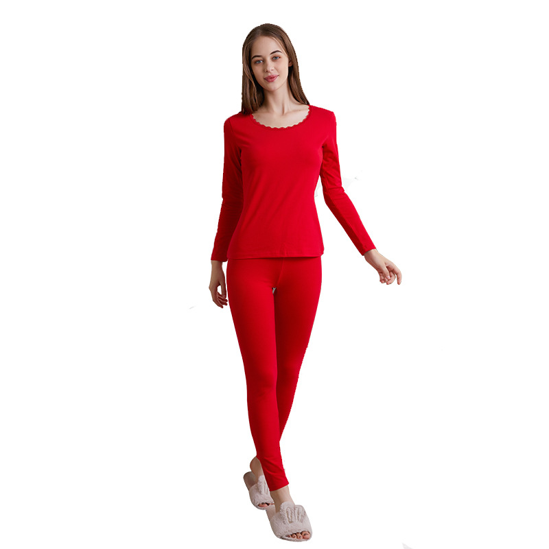 Lace collar autumn clothes sanitary pants set pure cotton lycra cotton heating clothes low round neck light blue light purple lace low neck